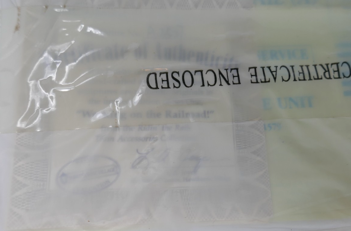 The Hawthorne Village 2005 Working on the Railroad Figures are a set of 6 small, hand-painted resin figures depicting people working on a railroad. Manufactured by Hawthorne Village in 2005, these figures come in the original styrofoam with certificate of authenticity. Perfect for any room during the holiday season, these collectibles are part of the Hawthorne Village collection and have a theme centered around a 21st-century railroad village.