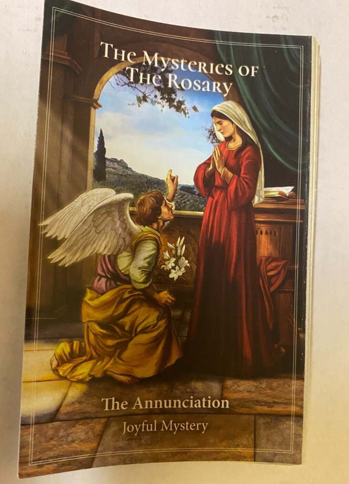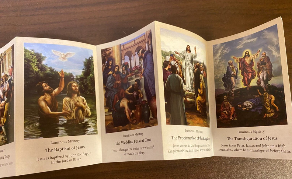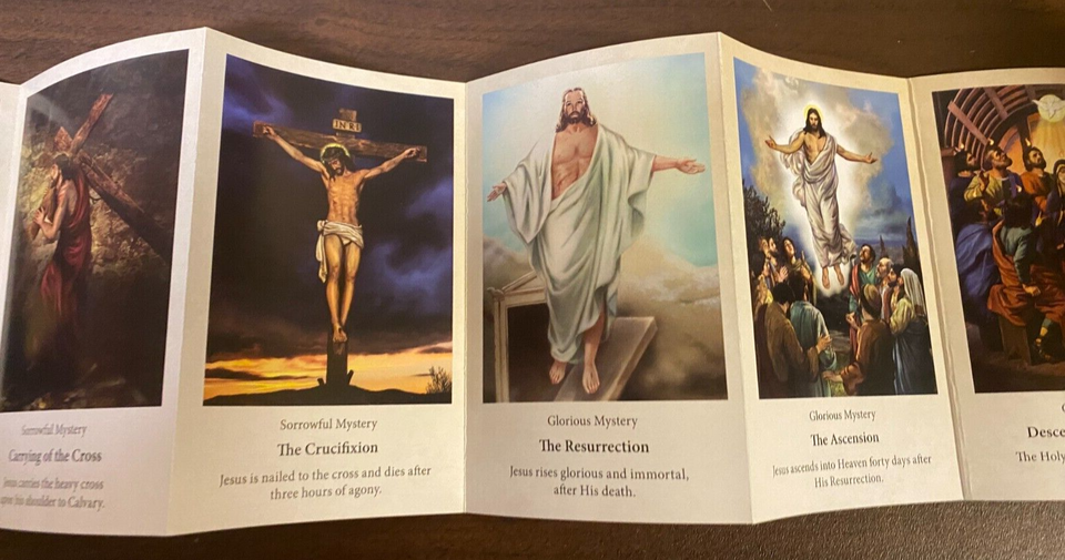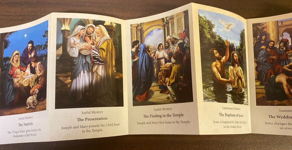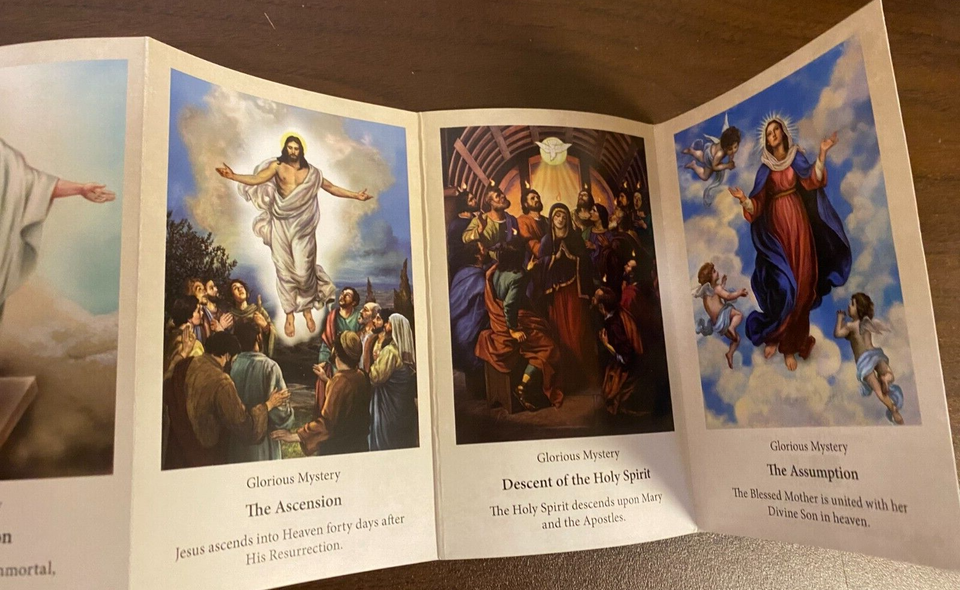 You are purchasing a very nice, convenient size prayer folder/accordion style. It comes with The Joyful, Luminous, Sorrowful, and Glorious Mysteries. Contains beautiful images. It is perfect to carry in a purse or pocket. They are wonderful teaching tools for children. To give as gifts or to share with family and friends. It comes with 10 prayers and 20 pictures.