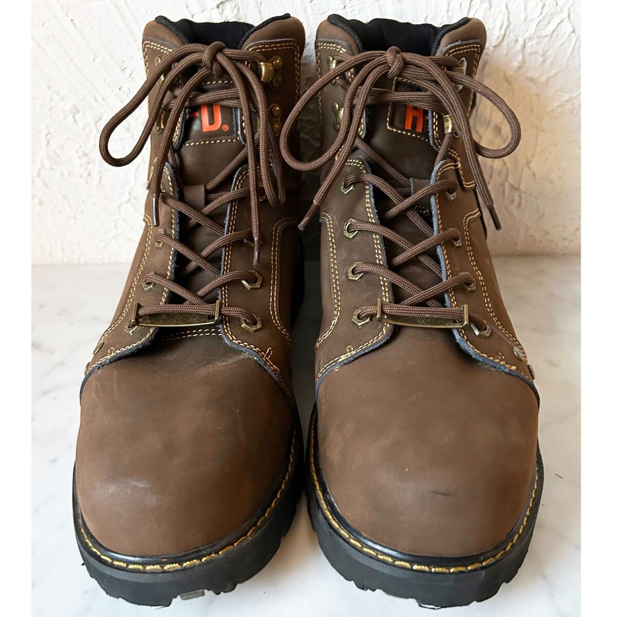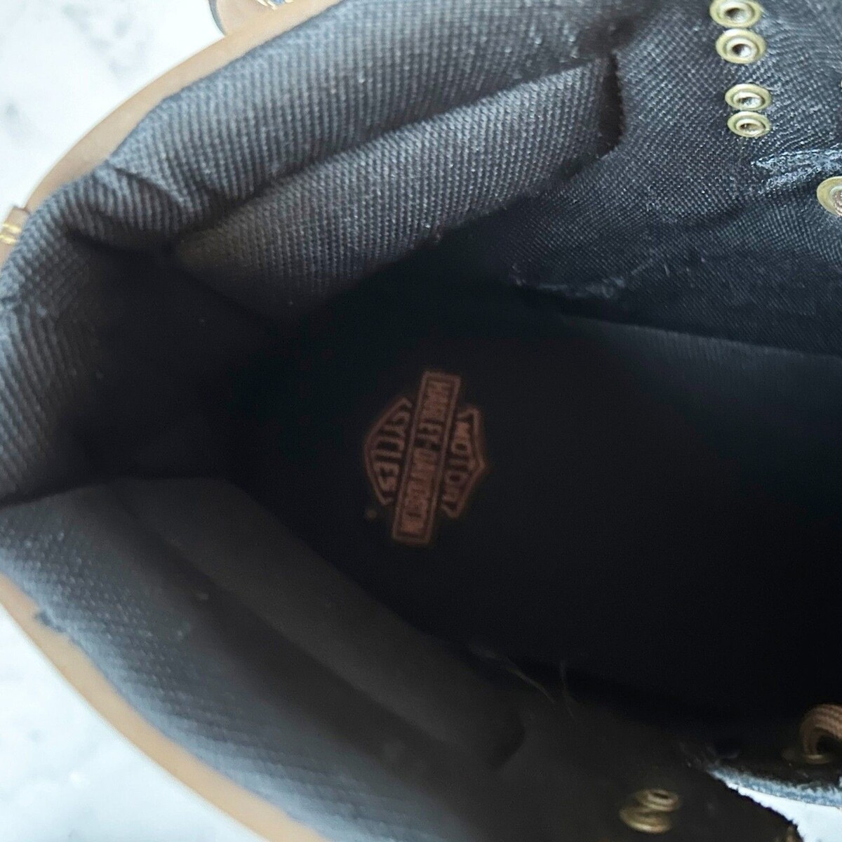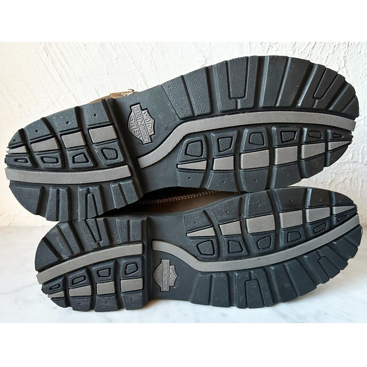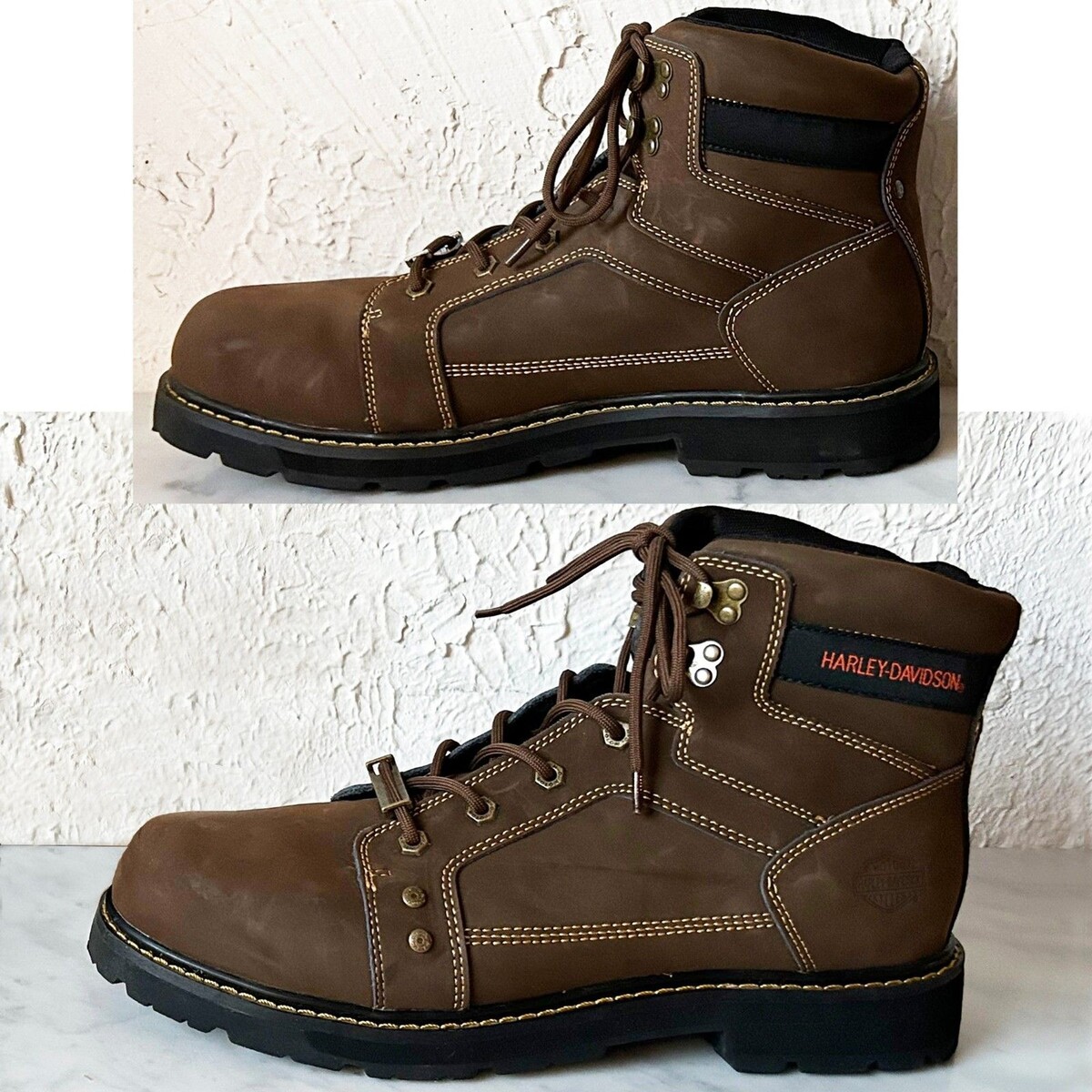 Harley-Davidson Men's size 11-1/2 brown 6-Inch Keating Motorcycle Boots. A brushed leather finish and smooth round toe sets this pair of boots apart from the crowd. Versatile enough for riding, working, hiking, and walking. Multi-layered panels toughen up the boot where it counts. With cord laces, metal logo eyelets and a pair of speed hooks, you'll have no problems putting these on fast. Harley-Davidson contrasting logos appear on the outside shaft and on the tongue. Made with full-grain leather uppers with a mesh lining. Rubber outsoles provide a flexible stride. The bottom of the sole has contrasting elements with a color coordinated Harley-Davidson Bar Shield Logo. The boot's sole, insole and upper are bound using time honored cement construction processes. Shaft height: 6", Heel height: 1.25".
