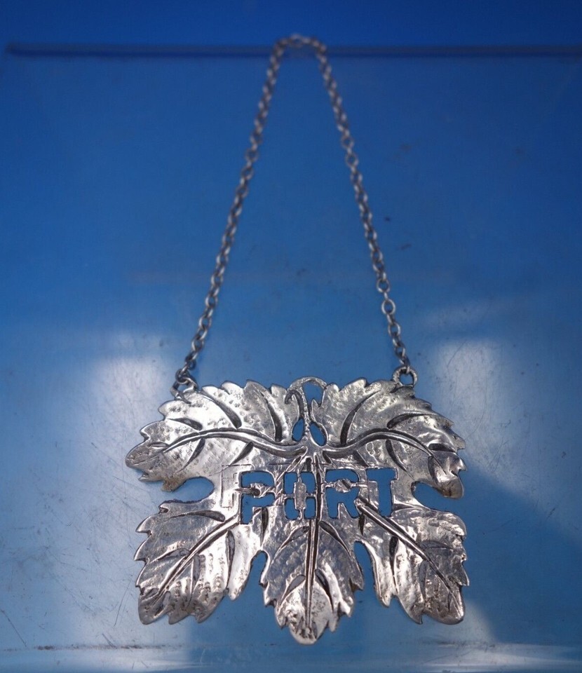 Wonderful sterling silver cast liquor label in leaf form (maker unknown). This label measures 2 1/8" x 1 1/2". It is pierced "Port" (see photos), and is in good vintage condition.