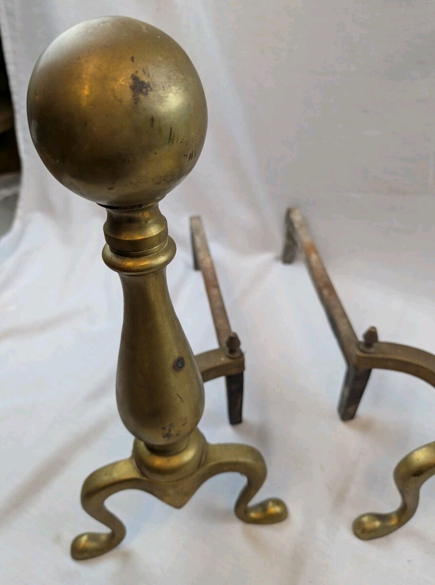 Up for sale is a Pair of Vintage Brass Cast Iron Ball Top Fireplace Andirons