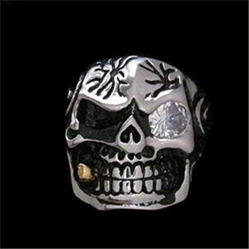 This pewter skull ring features a chunk of cubic zirconium in one eye, and a copper colored cigar sticking out of its teeth. Size per manufacturer 10.