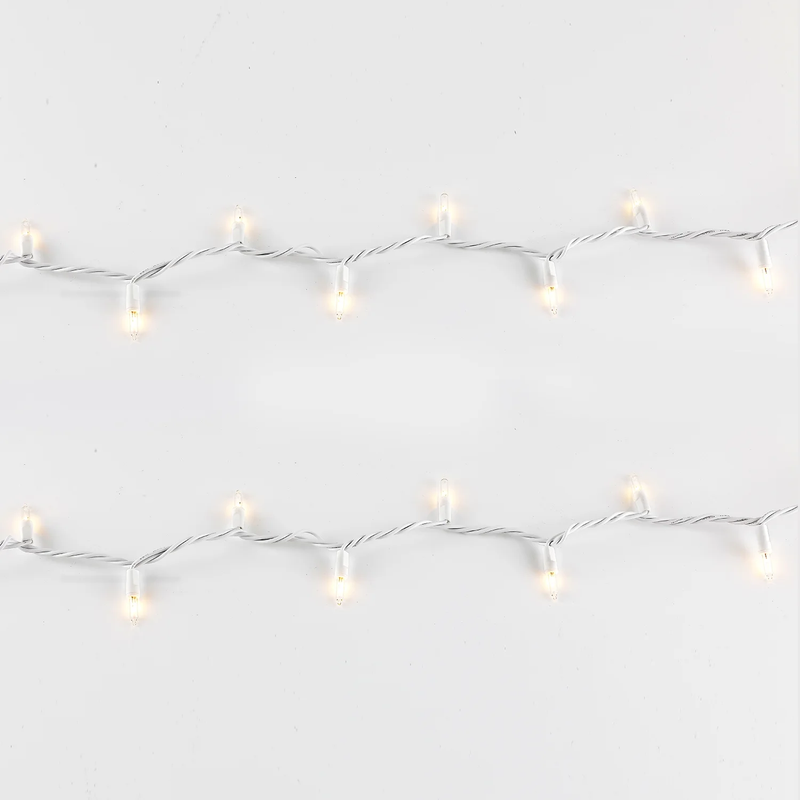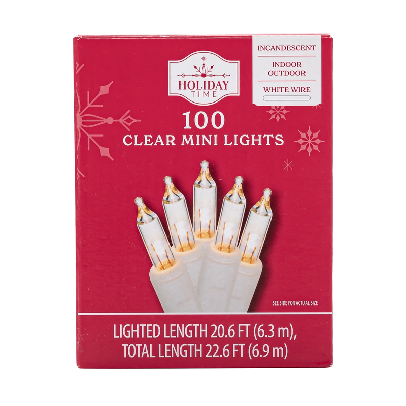 Holiday Time Indoor/Outdoor 100-Count Incandescent Mini Christmas String Lights, Warm White, 20.6' 100 warm white incandescent mini lights for a classic holiday glow Lighted length of 20.6 feet with total length slightly longer Perfect for decorating trees, wreaths, garlands, rooflines, and more End-to-end connectors allow multiple sets to be linked together Durable for both indoor and outdoor seasonal displays Creates a cozy, traditional holiday atmosphere year after year