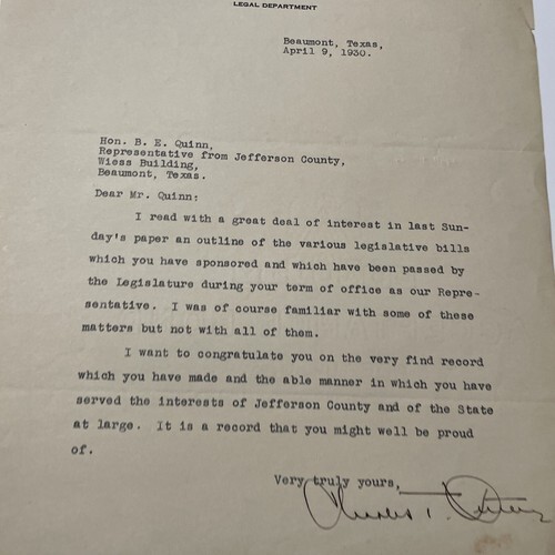 Letter is to B. E. Quinn who was the state representative from the Beaumont area at the time.