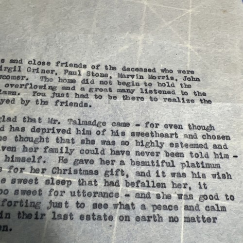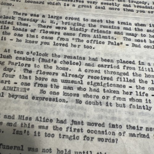 The letter talks about the death of a woman, not sure of the age, and mentions that flower arrangements sent included ?one from the man who took her life"