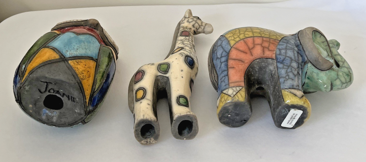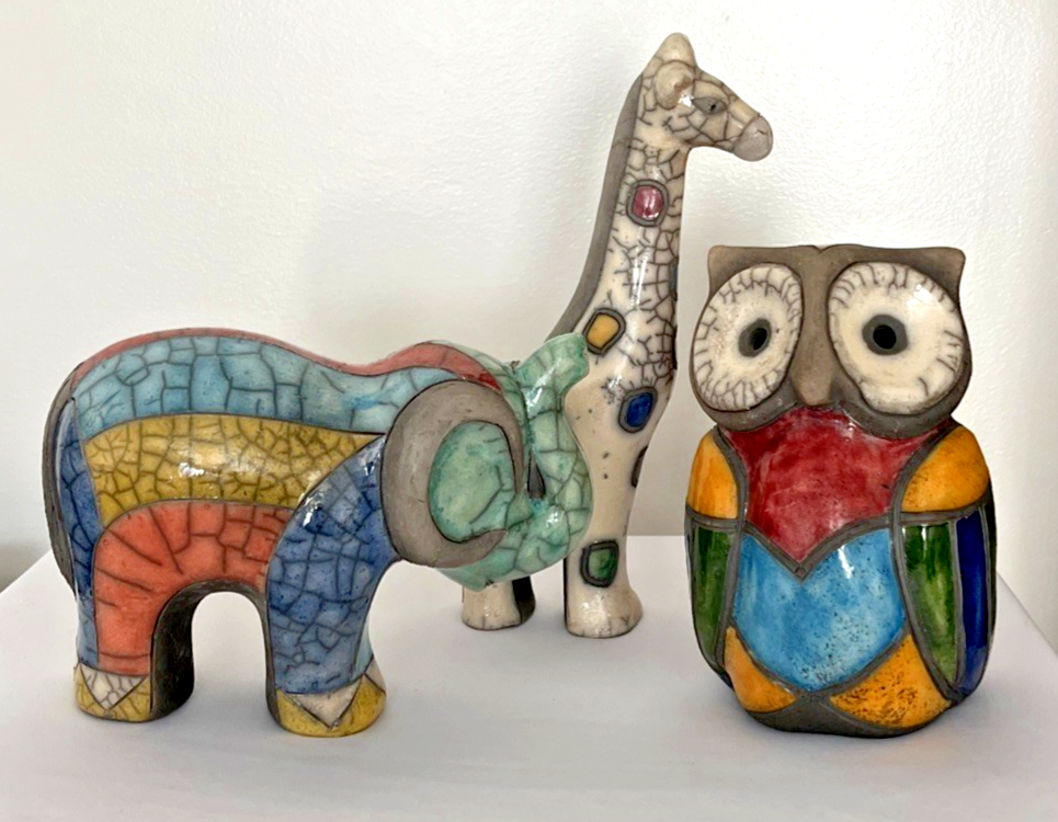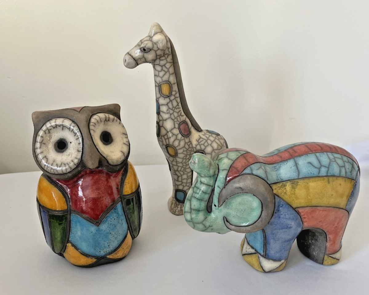 Lot of 3 South African Raku Painted Figures Elephant, Giraffe & Owl Signed