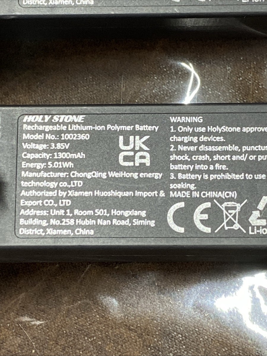 The product is a set of two Holy Stone rechargeable lithium-ion polymer batteries with a voltage of 3.8V and an amp hours of 1300mAh. These batteries come with a charger for convenience. They are designed for use in various consumer electronics devices, providing a reliable and long-lasting power source for multiple purposes. The lithium chemical composition ensures high performance and a lightweight design, making them suitable for a wide range of applications.