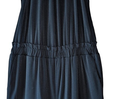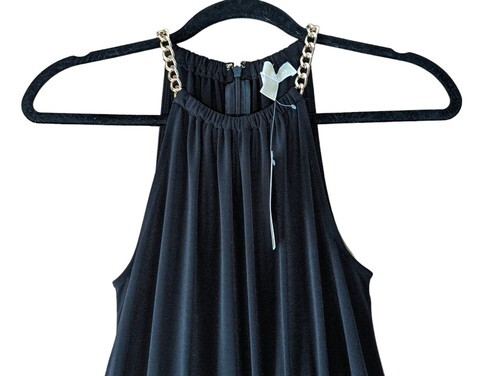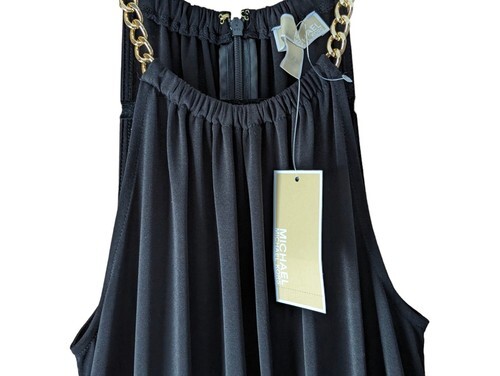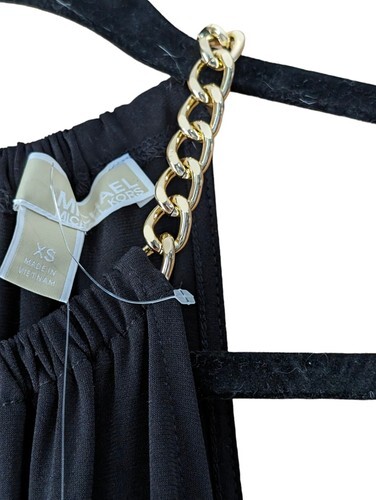 This is an absolutely gorgeous Michael Kors black dressy jumpsuit size extra small. Fits closer to a size small I would say. But because of the style where it's cinched at the waist it could go either way. Beautiful gold chain along the shoulders. So sexy and So STUNNING !!!
