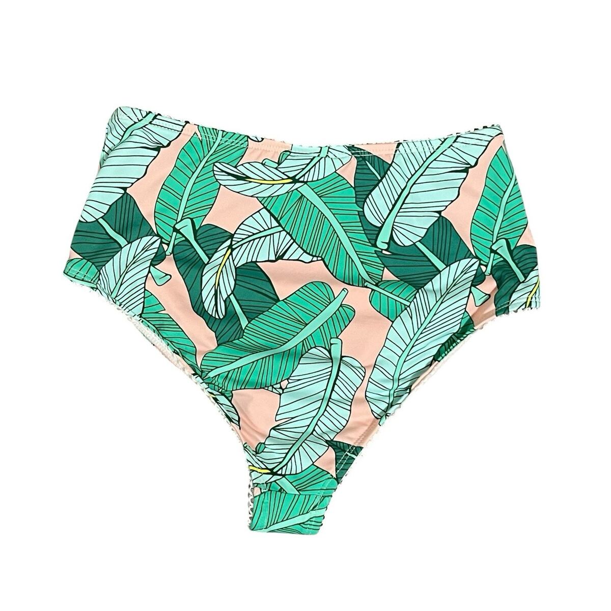 Palms Away Tropical Palm Leaf Print High Waisted Bikini Bottom Size S features: