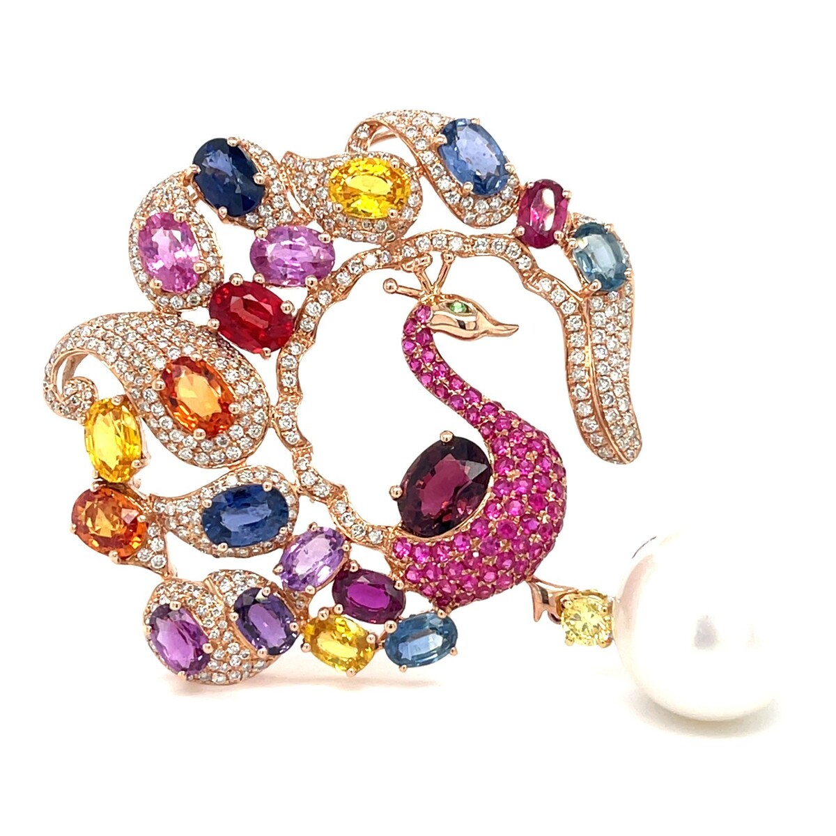 Schon Pfauenbrosche aus 14-karatigem Rosegold mit 21-karatigem Saphir + Rubin, 2-karatigem Diamant und 15-mm-Perle