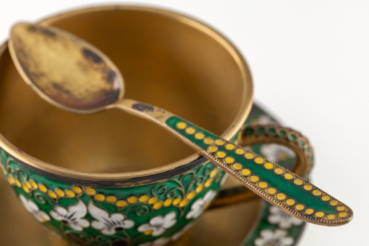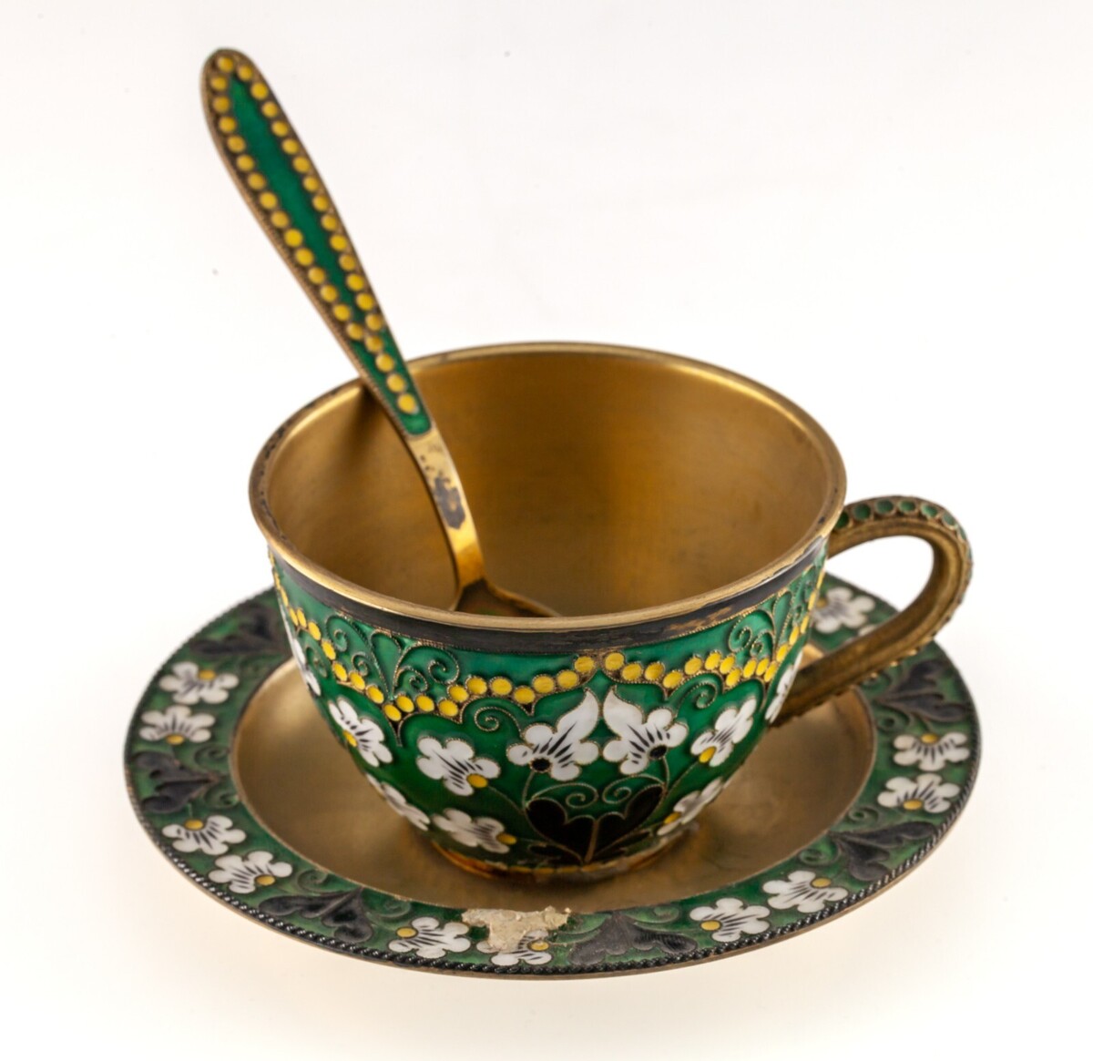 Sovietico russo dorato 916 smalto argento cloissone tazza di te, piattino e cucchiaio degli anni '50