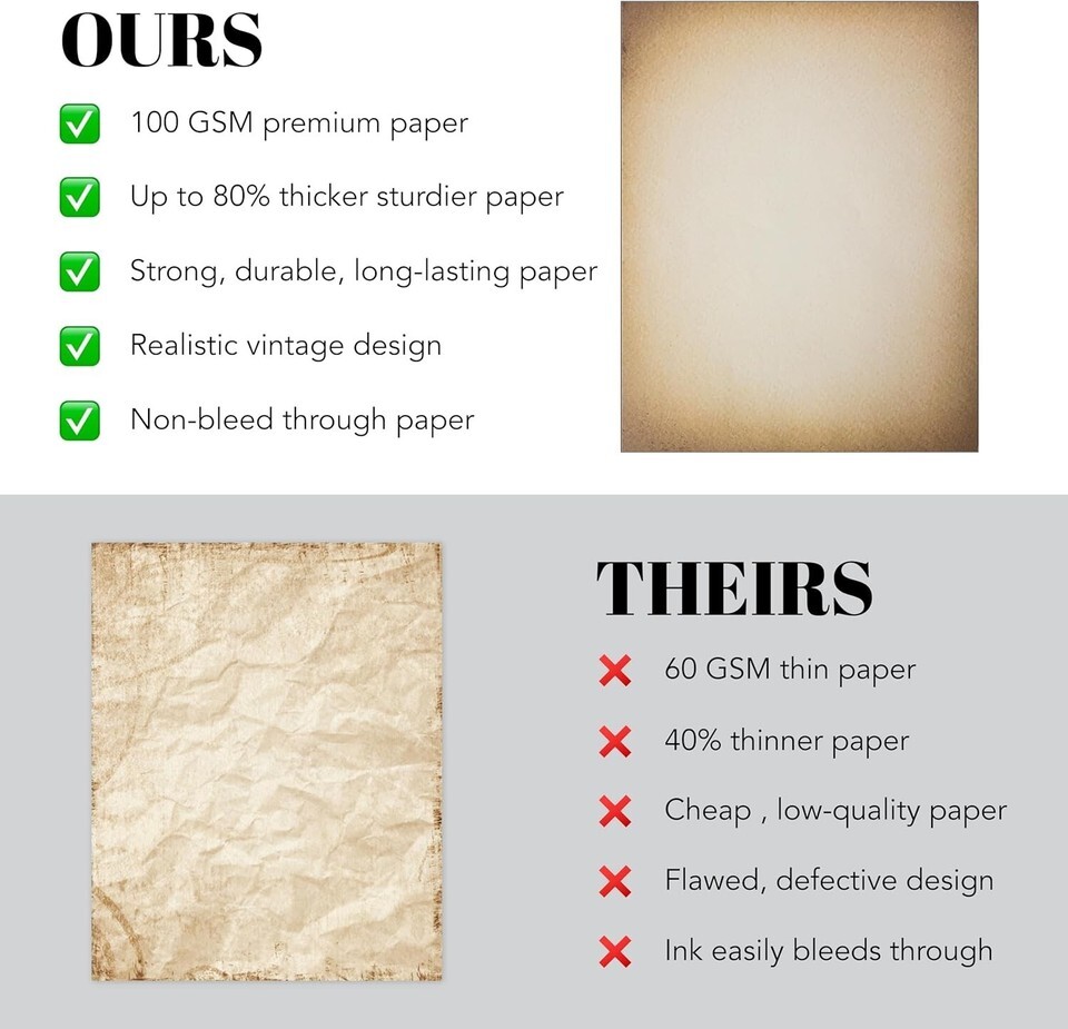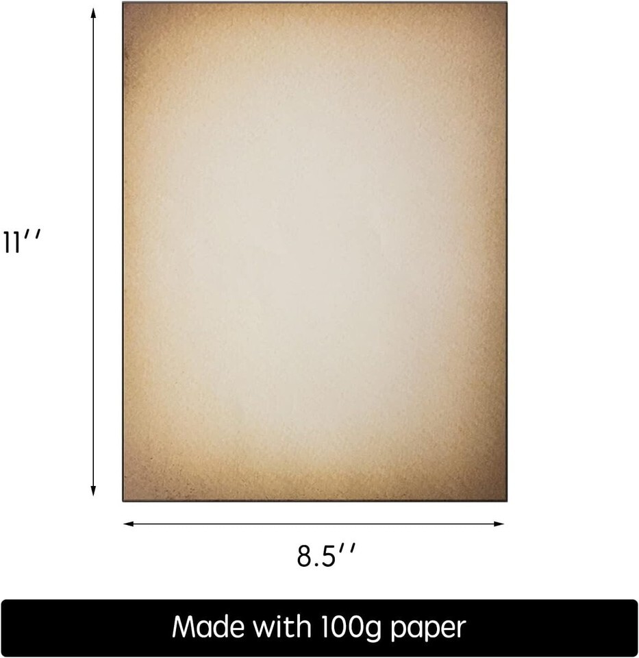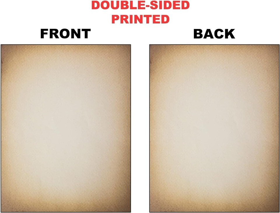EXCEPTIONAL QUALITY: Strong, durable and long lasting. Thick 100 GSM paper great for decoration and writing with no worries of ink bleed through paper. Our classic letter-size vintage paper measures 8.5 x 11 inches and fits perfect into most Laser and Ink Jet printers. The sheets can also be handwritten with most ink pens and added to existing scrapbooks and fits in a standard envelope.