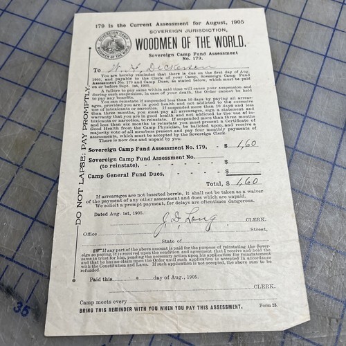 Woodmen Of The World 1905 Sovereign Camp Fund Receipt
