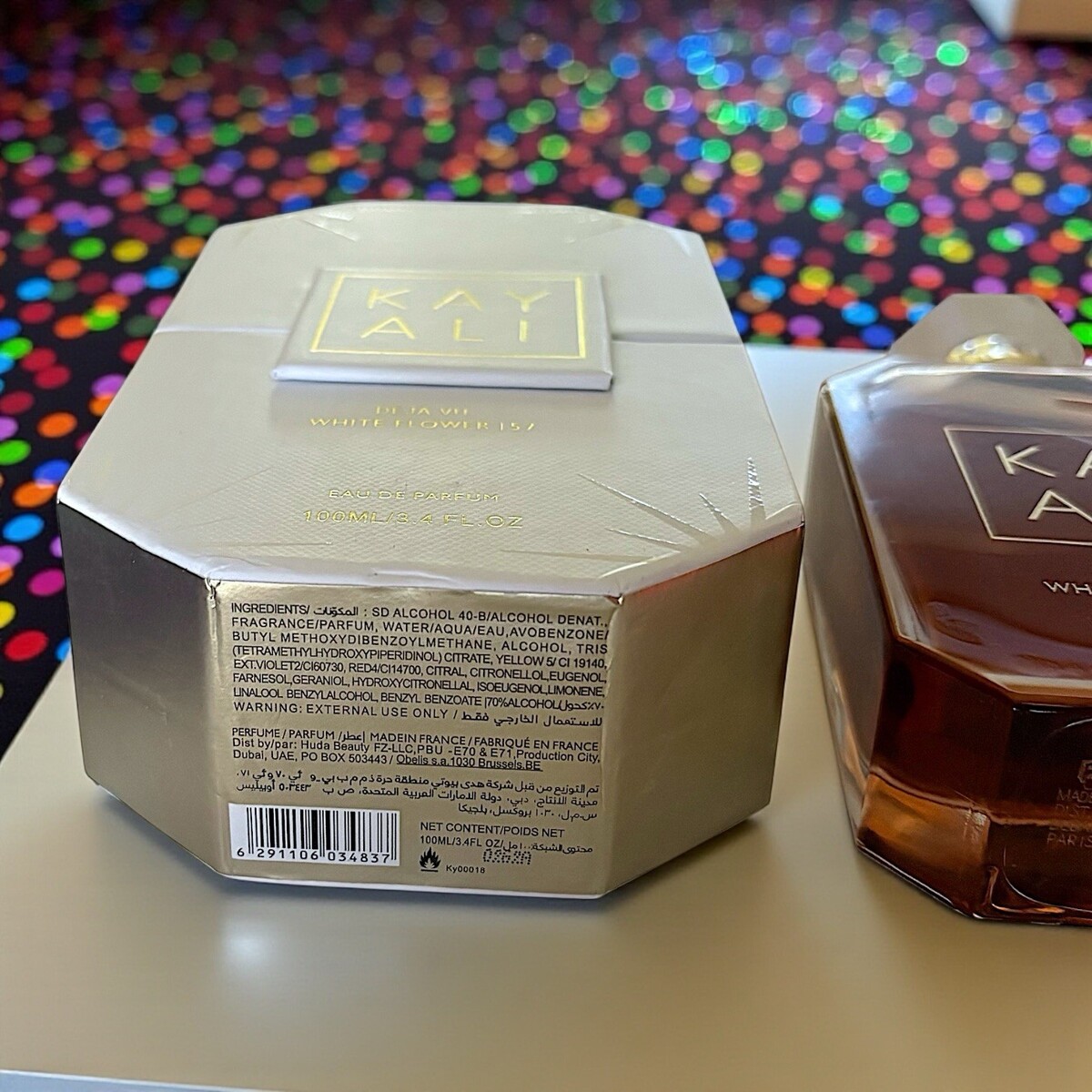 The scent profile, packaging, labeling, distributor information (Huda Beauty FZ-LLC), and factory code (KY00018) all match known authentic retail units. Juice color is the expected rich amber tone due to natural darkening of vanilla-based compositions.