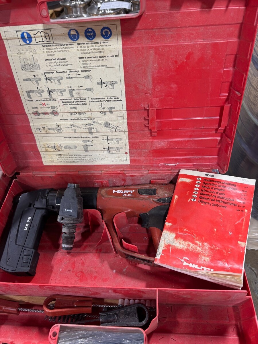 Hilti DX460 powder-actuated fastening tool set with MX72 magazine, X-460-F8 single shot attachment, and original Hilti case with operating manual. this is a used tool, but has been check tested and works like it should!