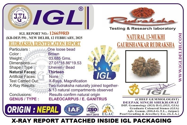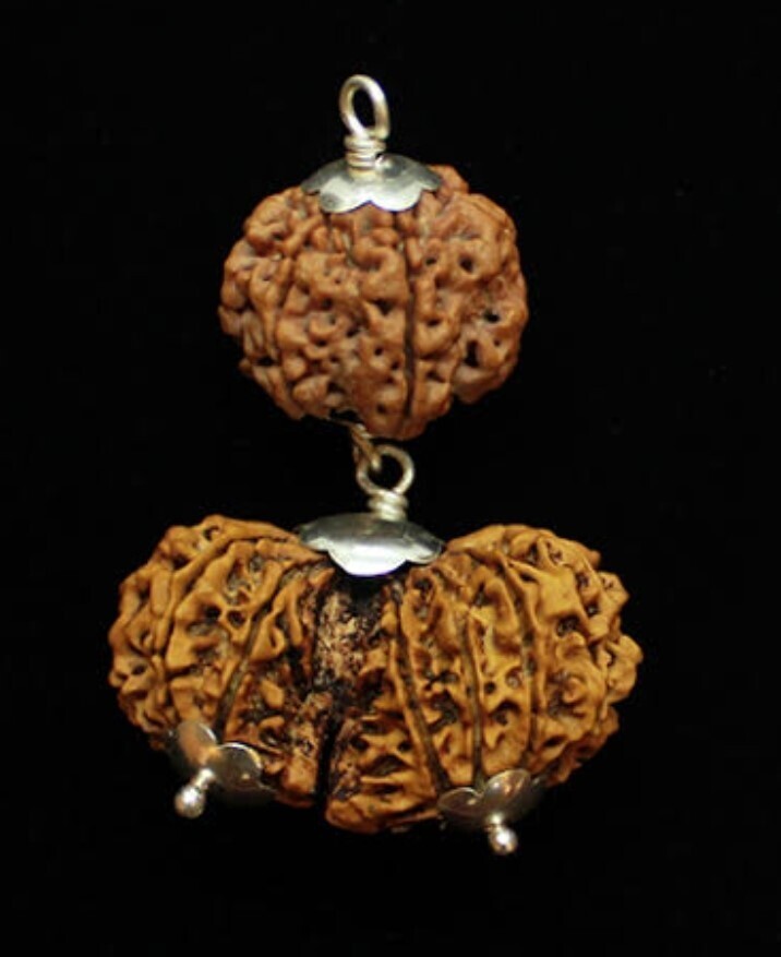 Design : one bead of Collector size 6 Mukhi Rudraksha , one bead of Nepali 13 Mukhi Gauri shankar Rudraksha , Linked with Rudraksha mala in pure silver .