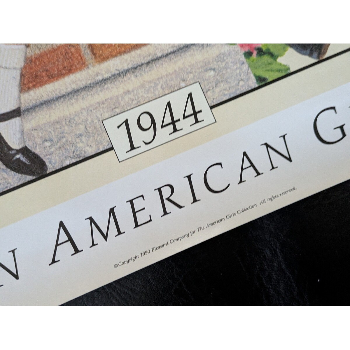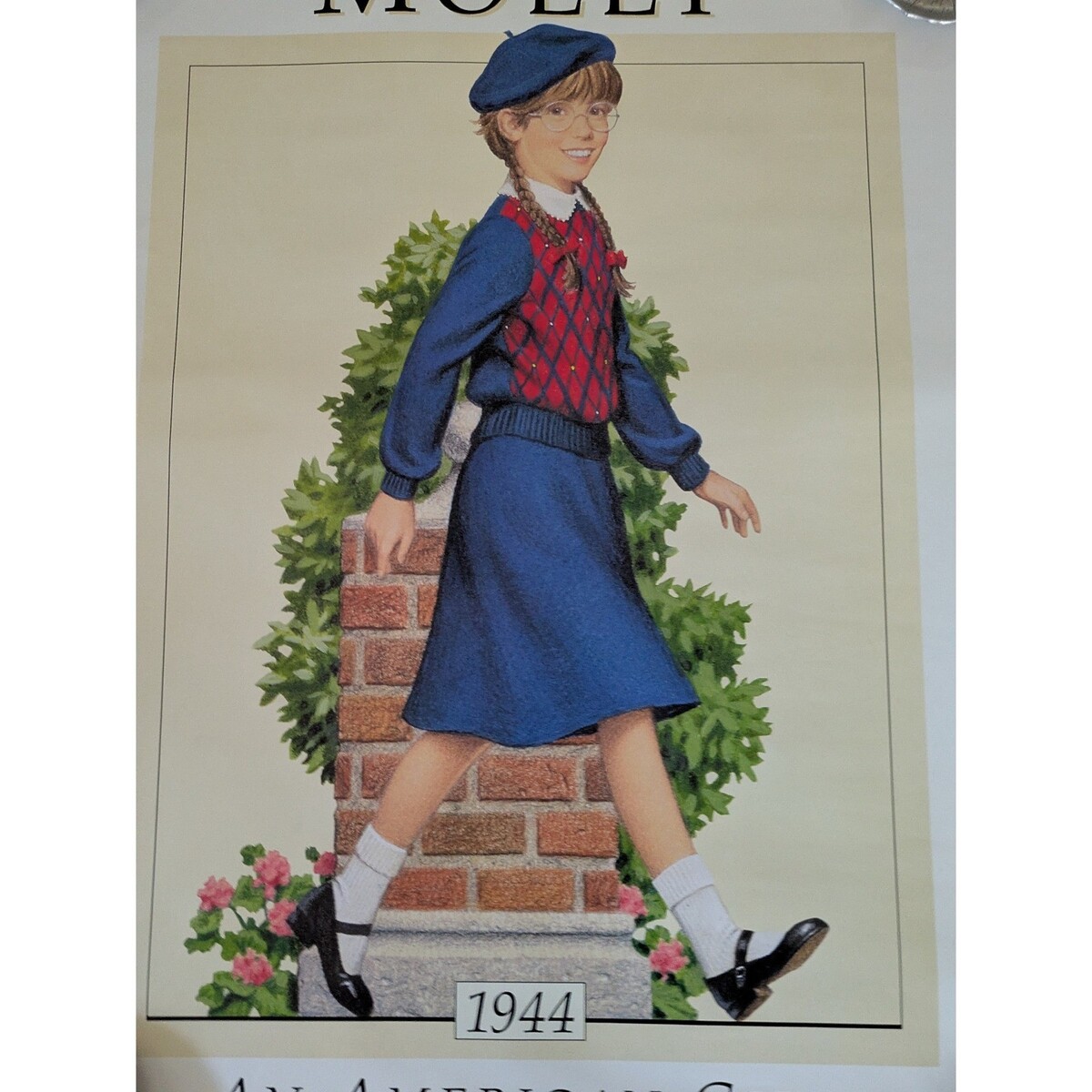 Mots cles : Molly McIntire, poupee historique, affiche vintage, Pleasant Company, annees 1940, decoration pour enfants, art nostalgique, imprime de collection, histoire americaine, souvenirs de poupee, style retro