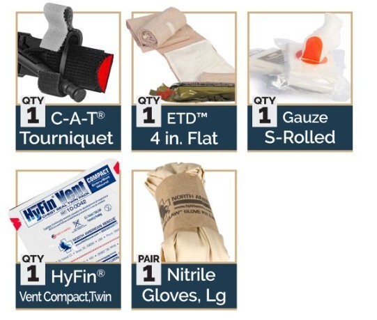 North American Rescue, M-FAK Mini First Aid Kit, Contains: 1 C-A-T Tourniquet, 1 ETD 4" Flat, 1 Gauze S-Rolled, 1 HyFin Compact Chest Seal Twin Pack, 1 Pair Nitrile Gloves in Large, 500 Denier Nylon Bag, Black Finish
