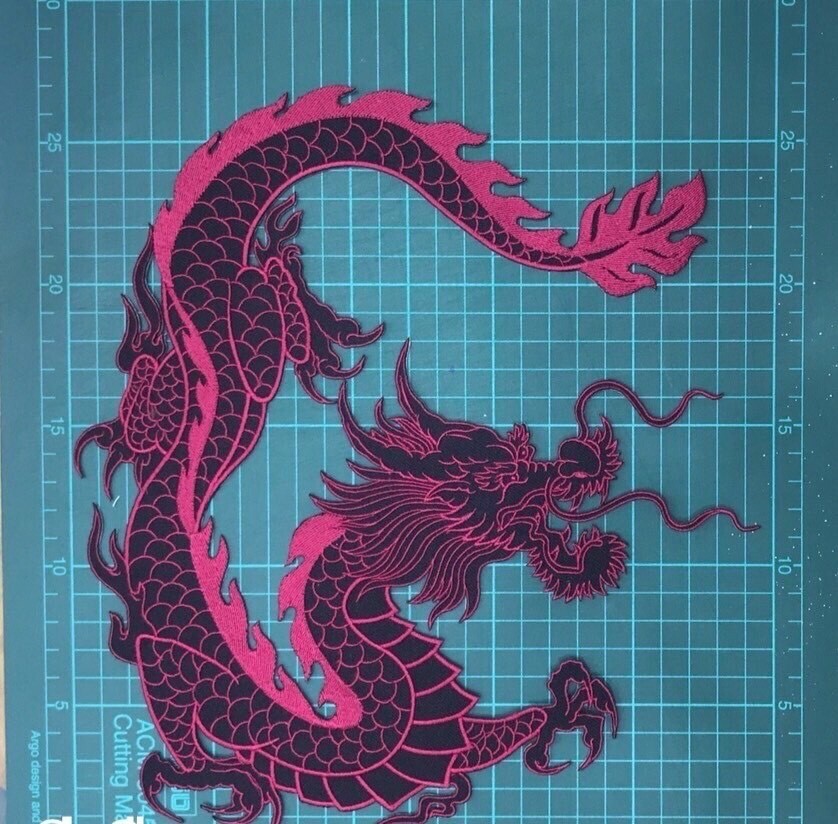 Designed for jacket backs and standout fashion pieces, these embroidered appliques come in fierce colorways like green, brown, and pink – all built on a sleek black dragon base.