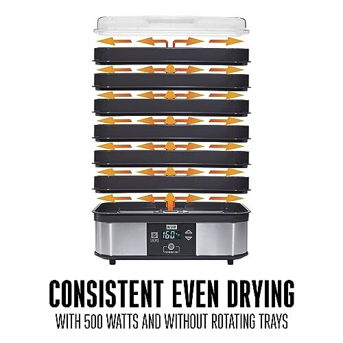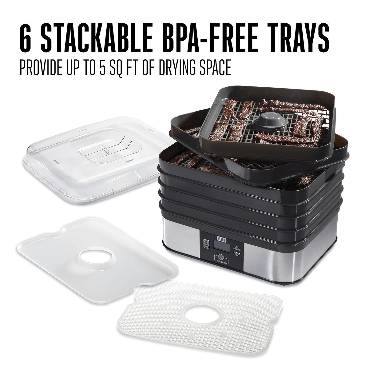 Bullet point: 6 STACKABLE, BPA-FREE TRAYS: The 6 trays provide up to 5 square feet of drying space for making plenty of all-natural foods and snacks with no added sugar or preservatives. Dry meat for jerky, fruit snacks, veggie chips and other healthy foods at home.