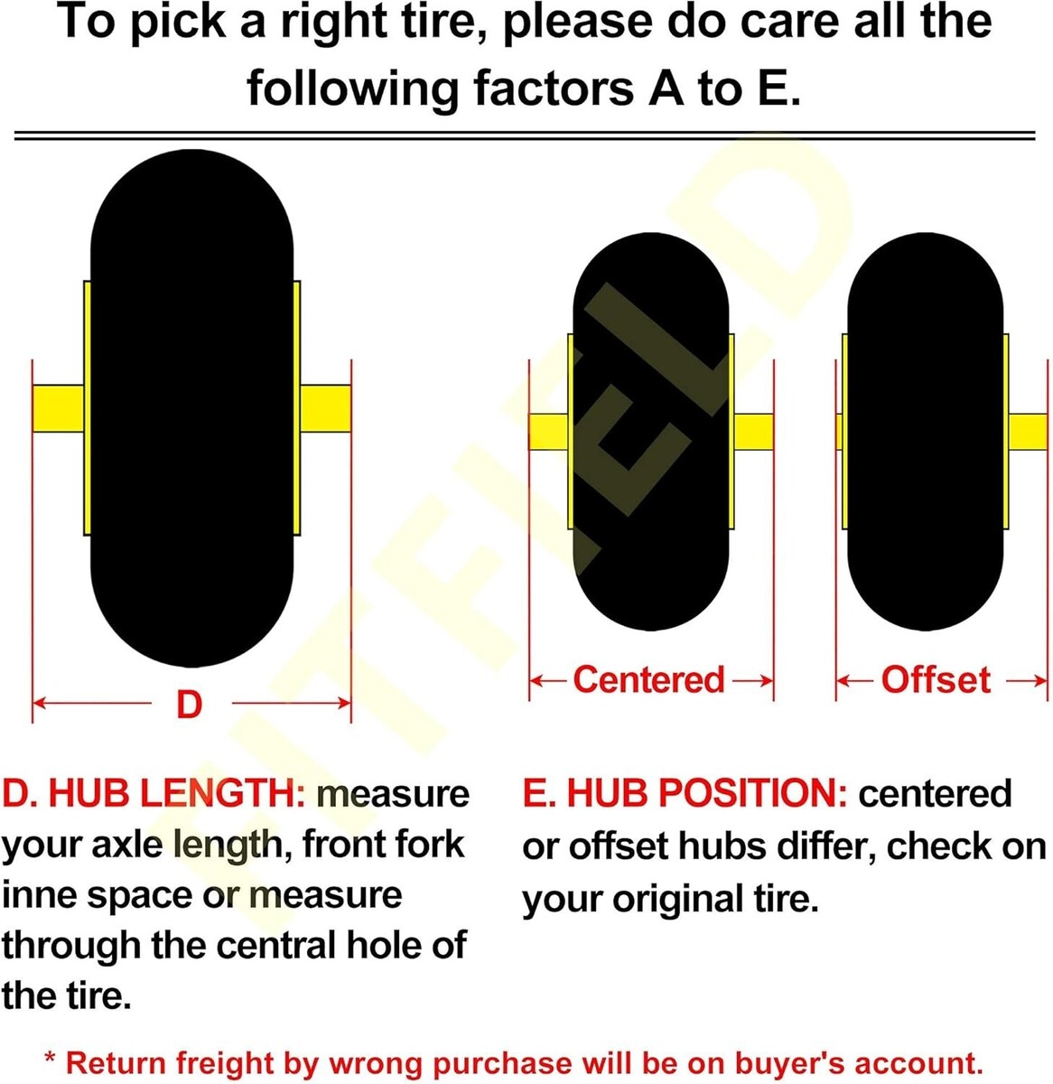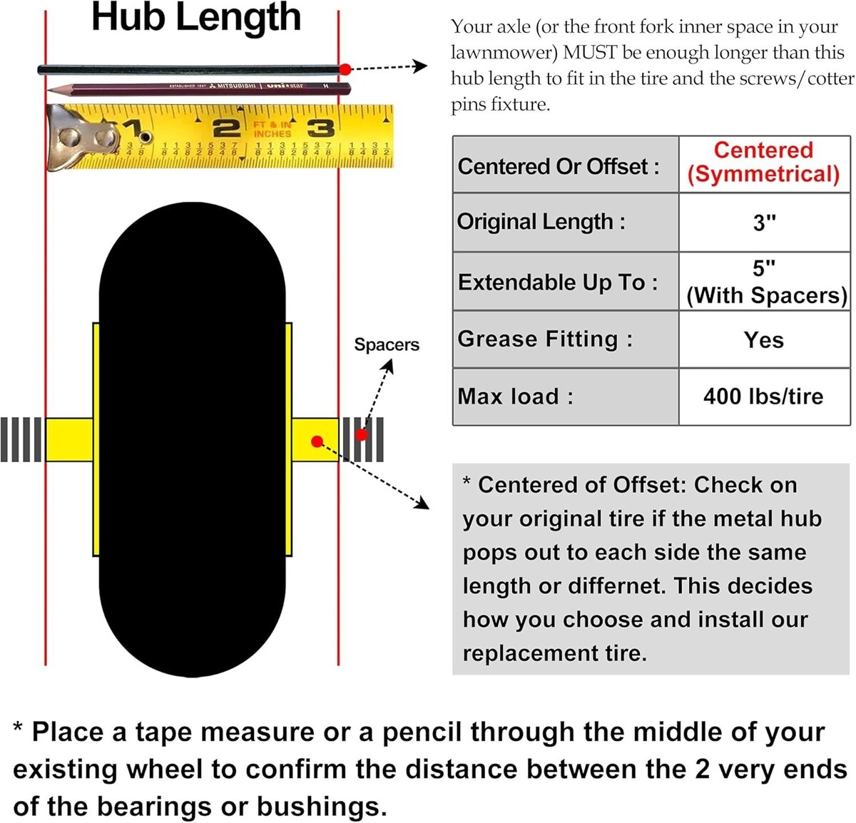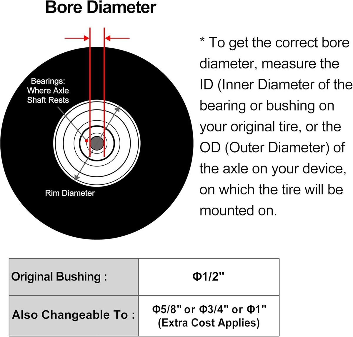 Dimensions: tire diameter: 10.6"; tire width: 4"; rim diameter: 5"; centered hub length: 3"; Bore: ?1/2"