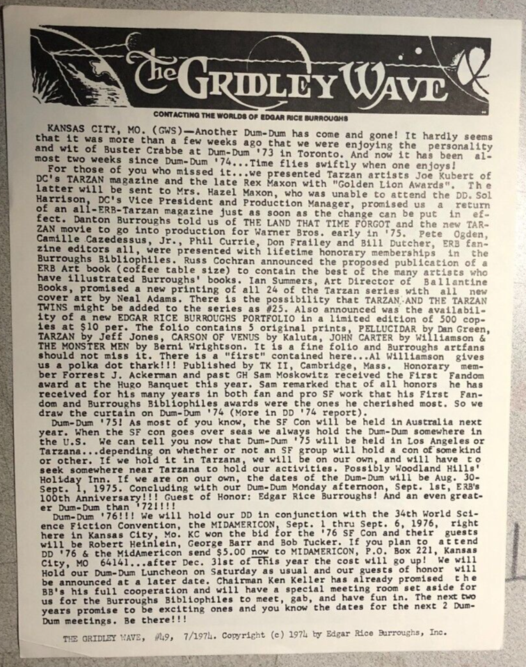 THE GRIDLEY WAVE #49 (1974) 2-page Edgar Rice Burroughs Tarzan fanzine