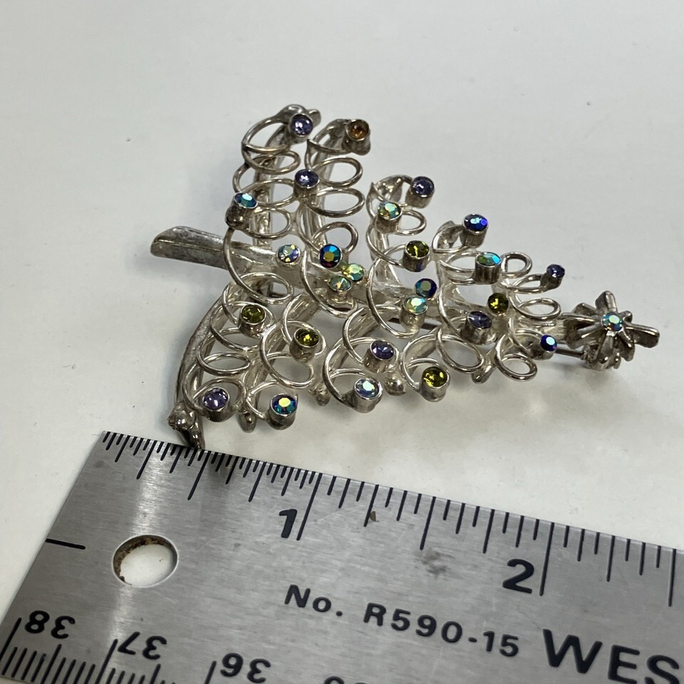 This is a vintage silver-tone Christmas tree pin with a scroll or curlicue design and aurora borealis rhinestones. Missing one stone so offering at a discount and with free shipping.