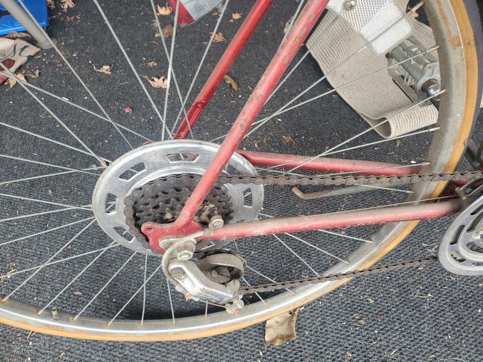 Paint is chipping, and some rust on the surface. Needs some TLC from the right owner. Do not know much about bikes, so please send any pertinent questions I should list out here my way if you are interested. It is a 10 speed. See chains to confirm.