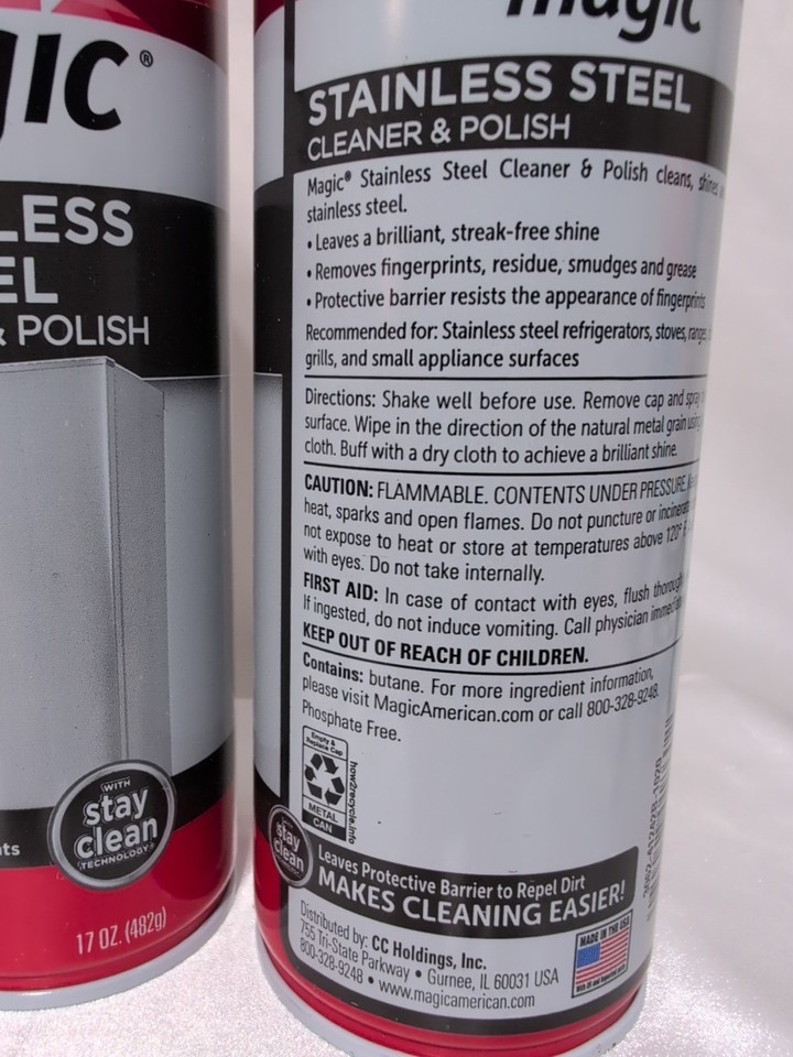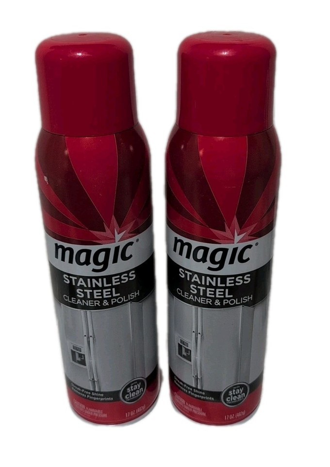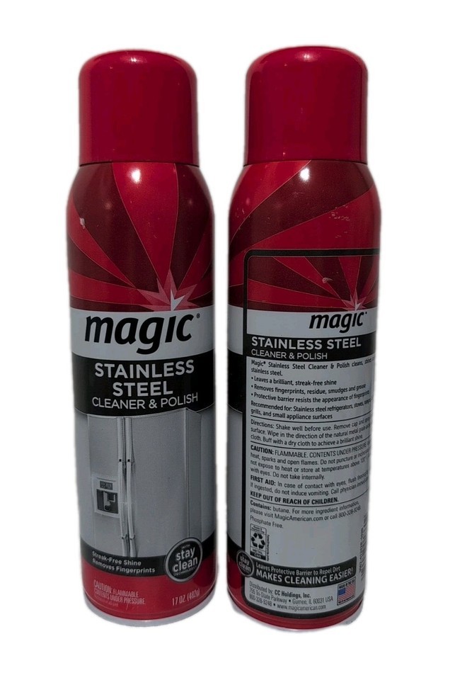 Give your stainless steel appliances a showroom shine with this Lot of 2 Magic Stainless Steel Range Appliance Polish Cleaner! Each bottle delivers powerful cleaning action that removes fingerprints, smudges, water marks, and grease while leaving behind a protective barrier to keep surfaces looking like new.
