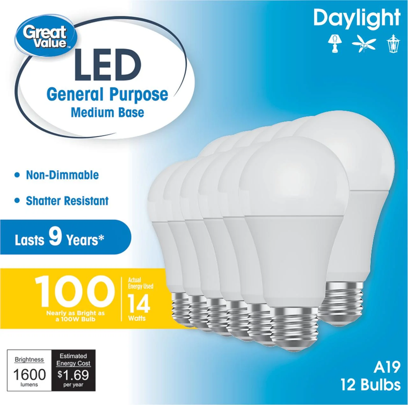Great Value A19 LED Light Bulbs, 100 Watts Equivalent, General Purpose, 9yr, Medium Base, Daylight, 12 Pack
