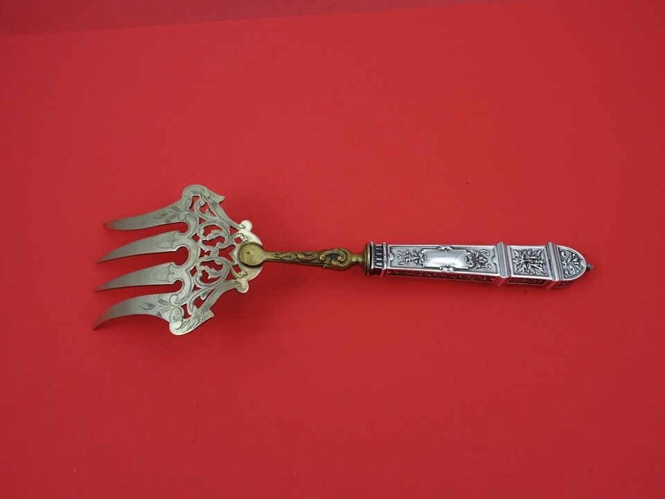 German Sterling Fish Serving Fork hollow handle with plated tines gold tone. Plating a bit worn. .800 silver handle 9 3/4" by Various Makers. It is not monogrammed and is in excellent condition.
