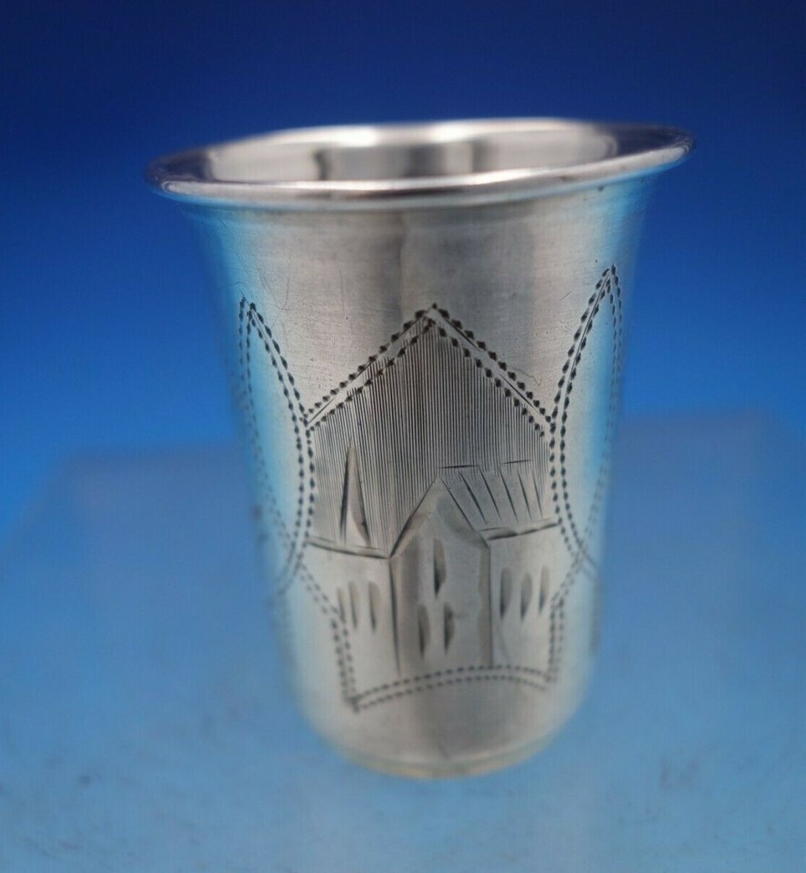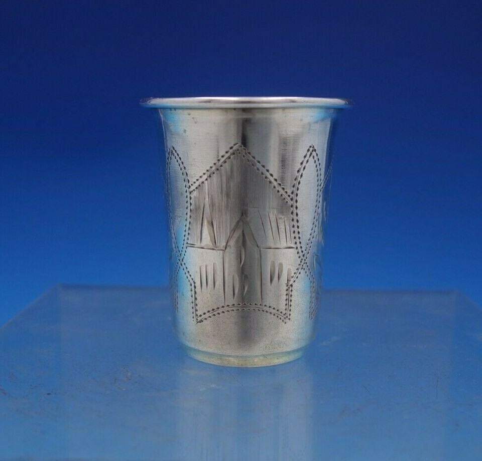 Wonderful Russian sterling silver cup for vodka with gold washed interior circa 1908-1917 (maker unknown). This piece features an engraved design (see photos). This cup measures 2 1/4" tall x 1 3/4" and weighs .91 troy ounces. It is not monogrammed and is in good vintage condition. Superb!