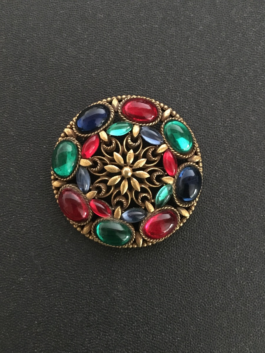Corocraft brooch mid-century vintage, gorgeous, large, round, red, green, blue, gold pin