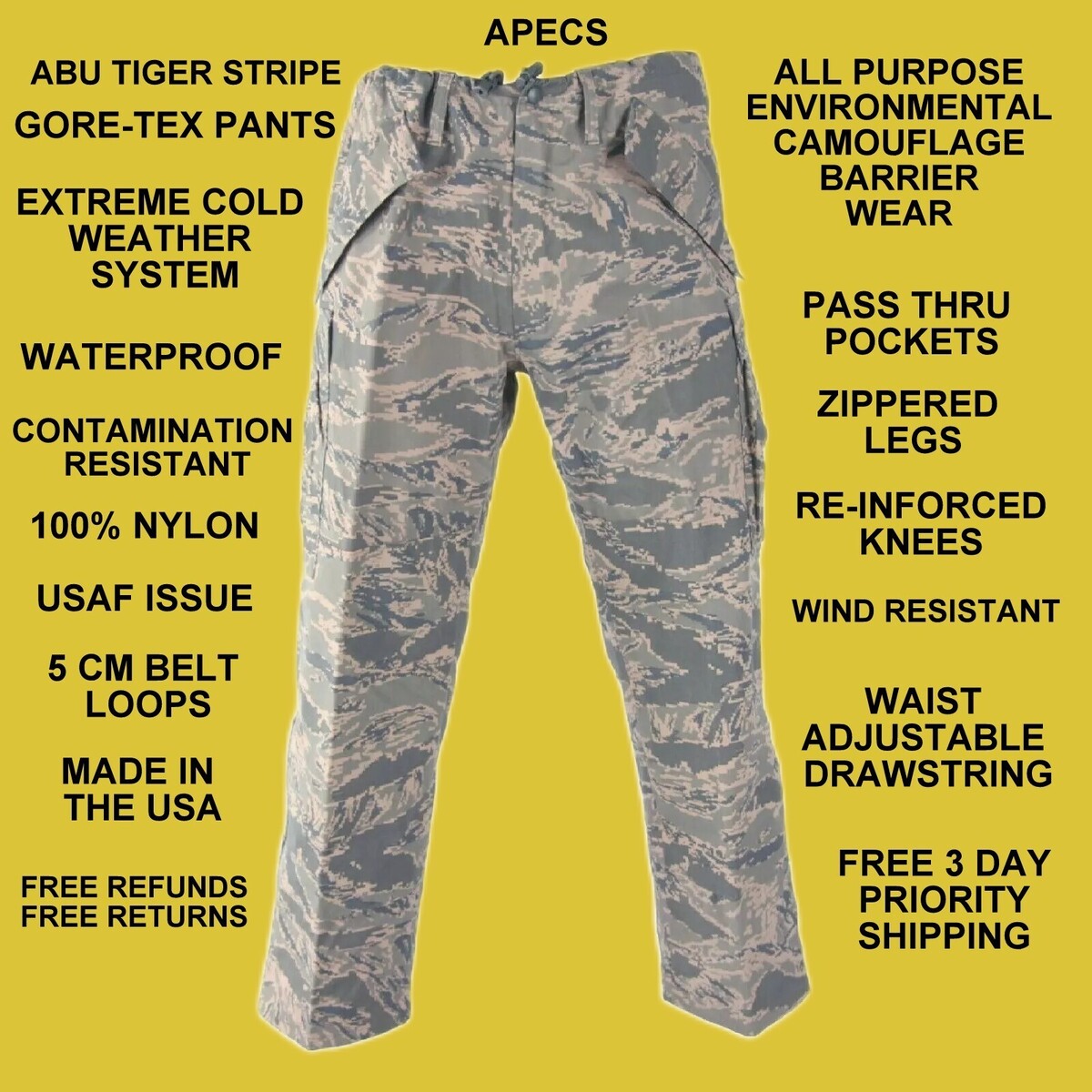 United States Air Force issue Extended Cold Weather Clothing System for the US Air Force, the APECS offers superior protection without sacrificing comfort or breathability. Durably crafted of ultralight Gore-Tex fabric, the trousers are highly resistant to water, wind, sand and exposure, even after repeated washings.