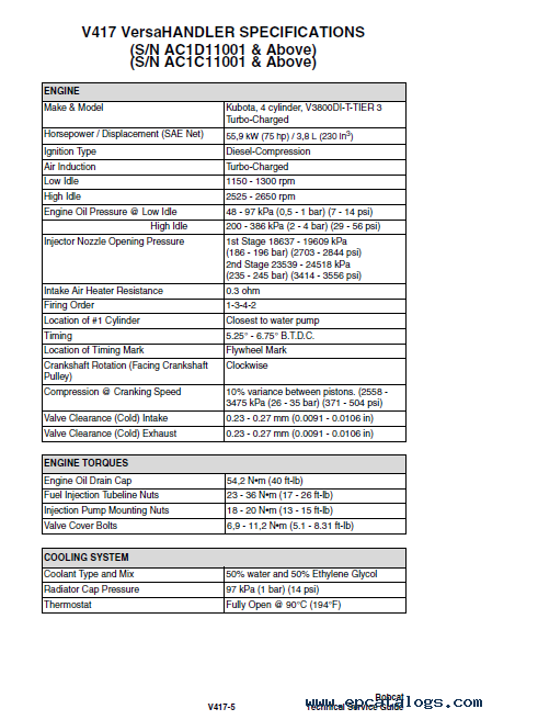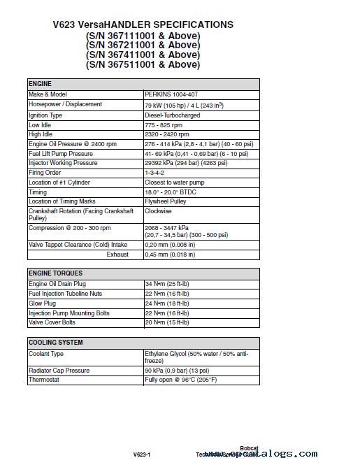 This technical service guide includes information about specifications next vehicles Bobcat: