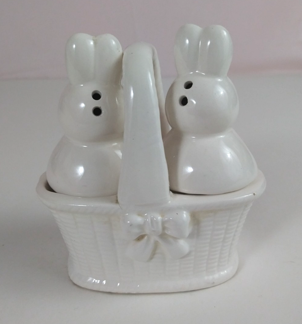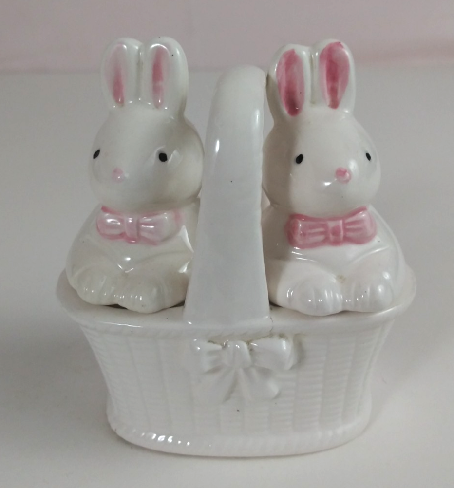 Vintage Adorable Bunny Rabbits Sitting In Basket Salt & Pepper Shakers