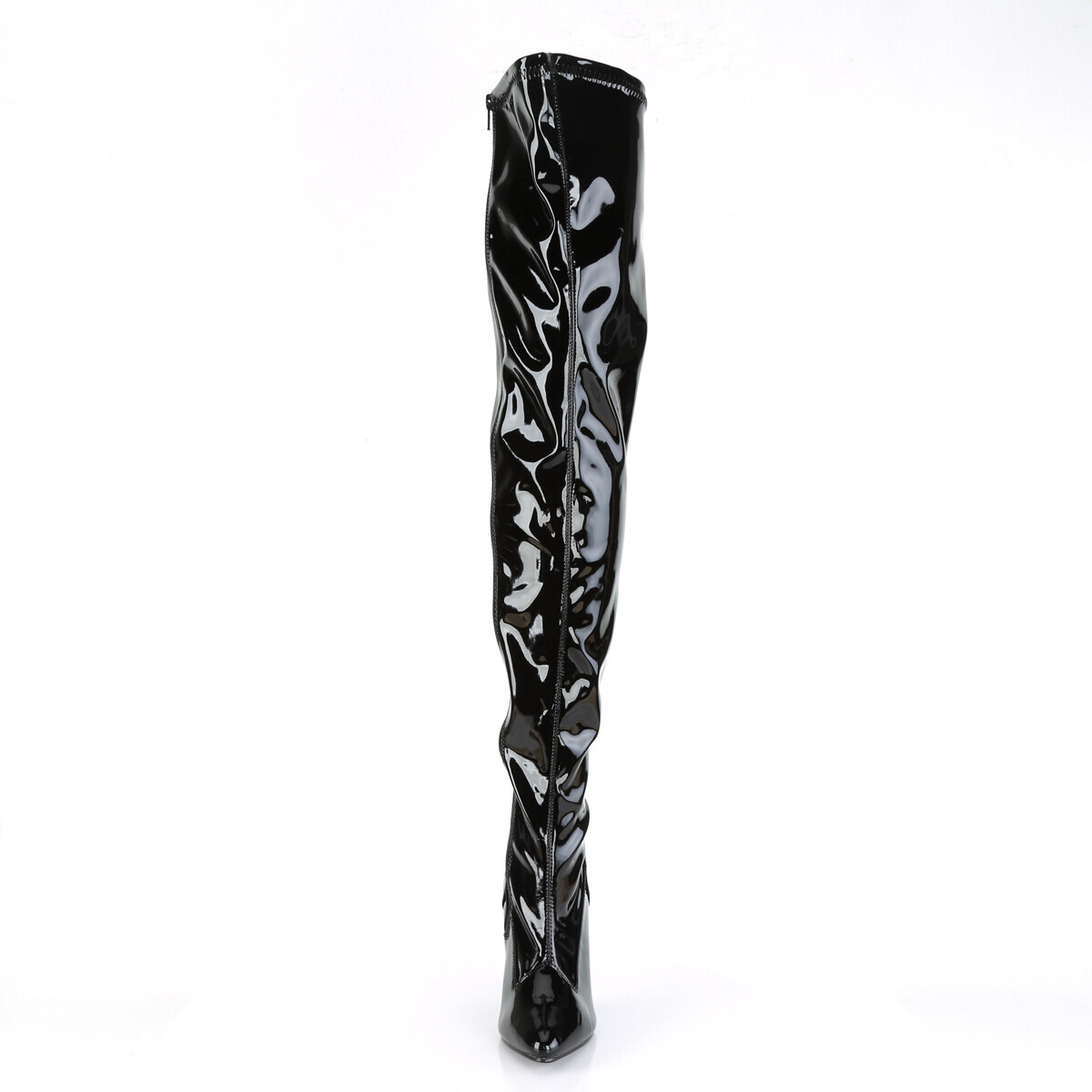 5" Heel Black Stretch Patent Thigh High Boots With Side Zip.