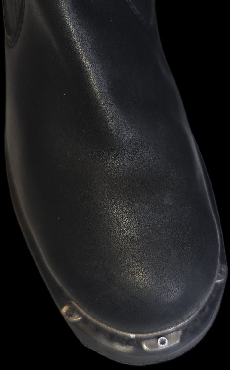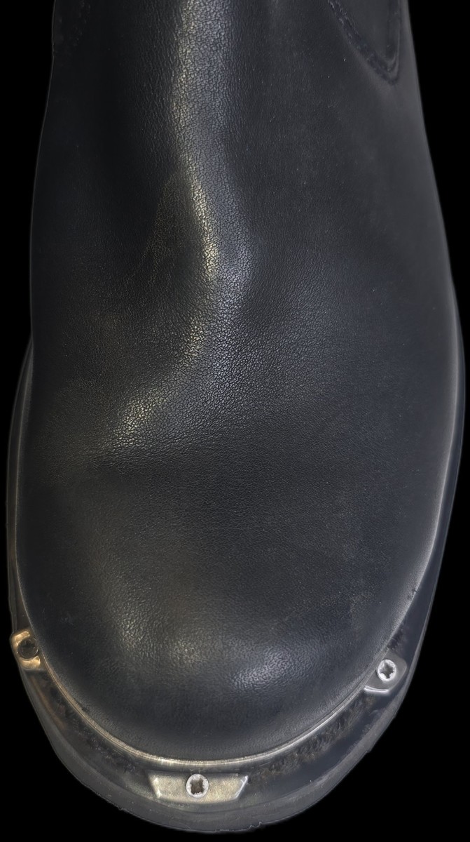 See pics. There's a stain i can't get out on the toe of the right boot. A slight nick on the same side by zipper.