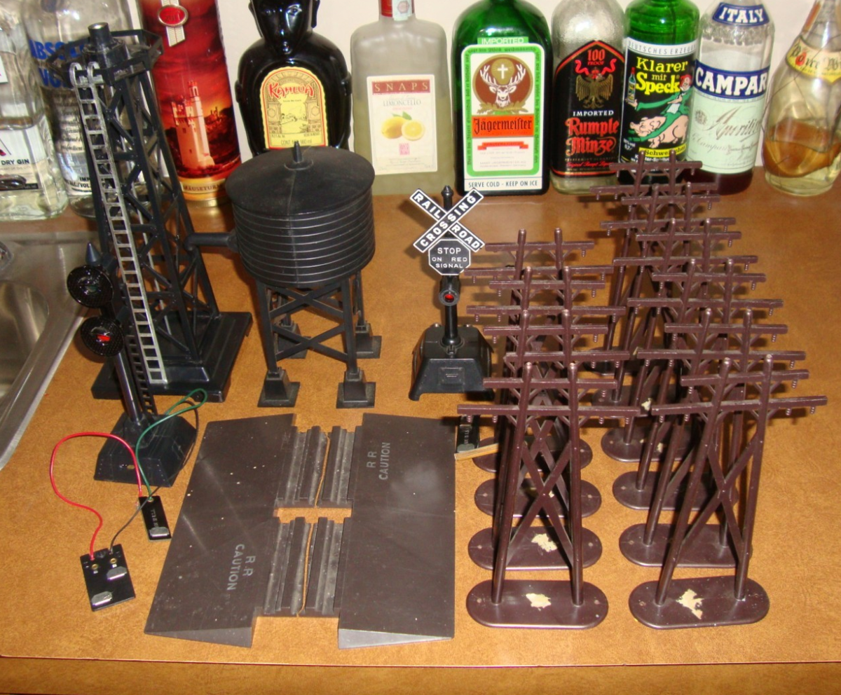 MARX POSTWAR O GAUGE RAILROAD SIGNALS AND ACCESSORIES 1960'S. Tower is missing top and 4 of the telephone poles have a tiny piece broke off the cross part that would hold the electric lines. The level crossing is broke in half but track will hold it together just fine. Four of the 10 poles have one of the small parts broke off. Nothing else is bent or broken. Signals have the connection pieces and are in excellent condition. I am the original owner. Items have been boxed for over 60 years.