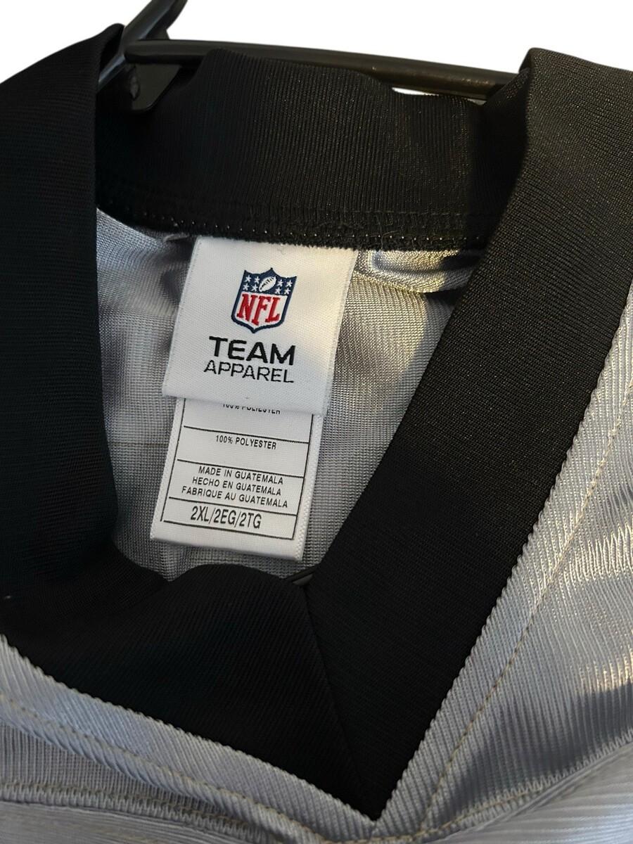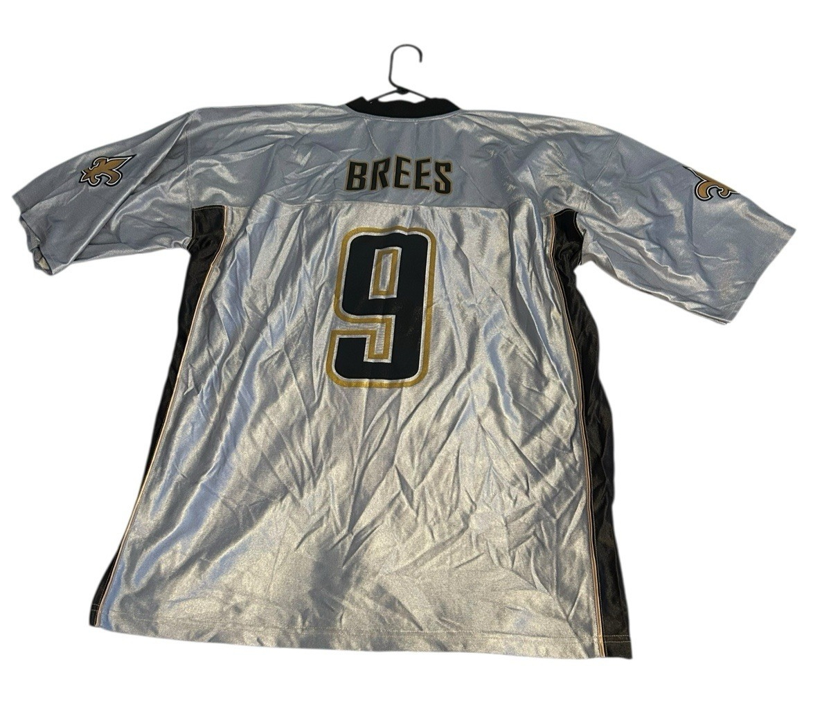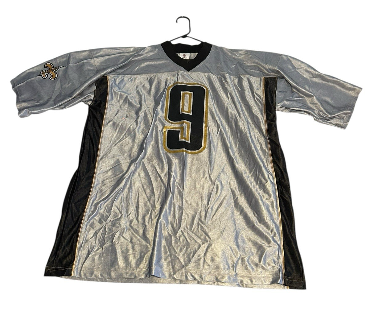 The product is a Drew Brees #9 jersey in men's size 2XL, officially licensed by the NFL and featuring the colors silver, black, and gold. It is a part of the NFL Team Apparel line and represents the New Orleans Saints. This unisex adult jersey is perfect for fans of the National Football League looking to show their support for Drew Brees and the Saints in style.