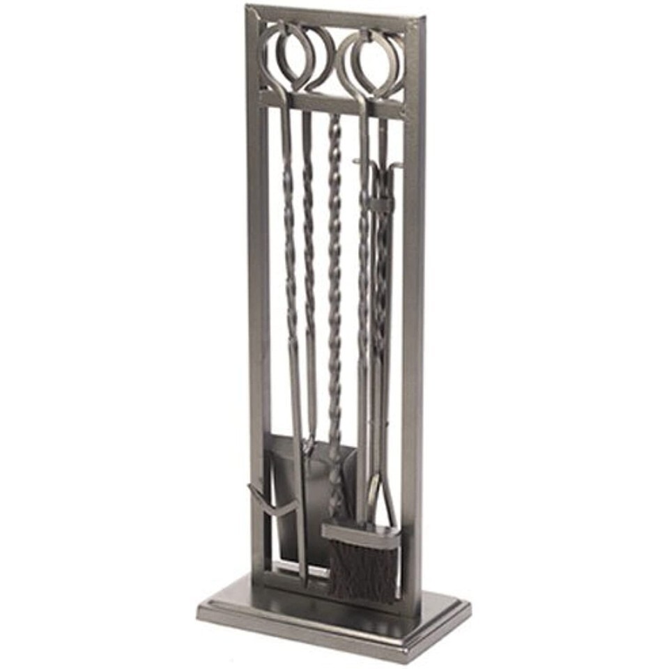 5 piece, Antique iron, modern twist style Fireplace tool set, includes brush, Shovel, poker, tongs, stand, 100 % powder coated steel construction.