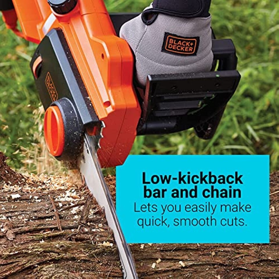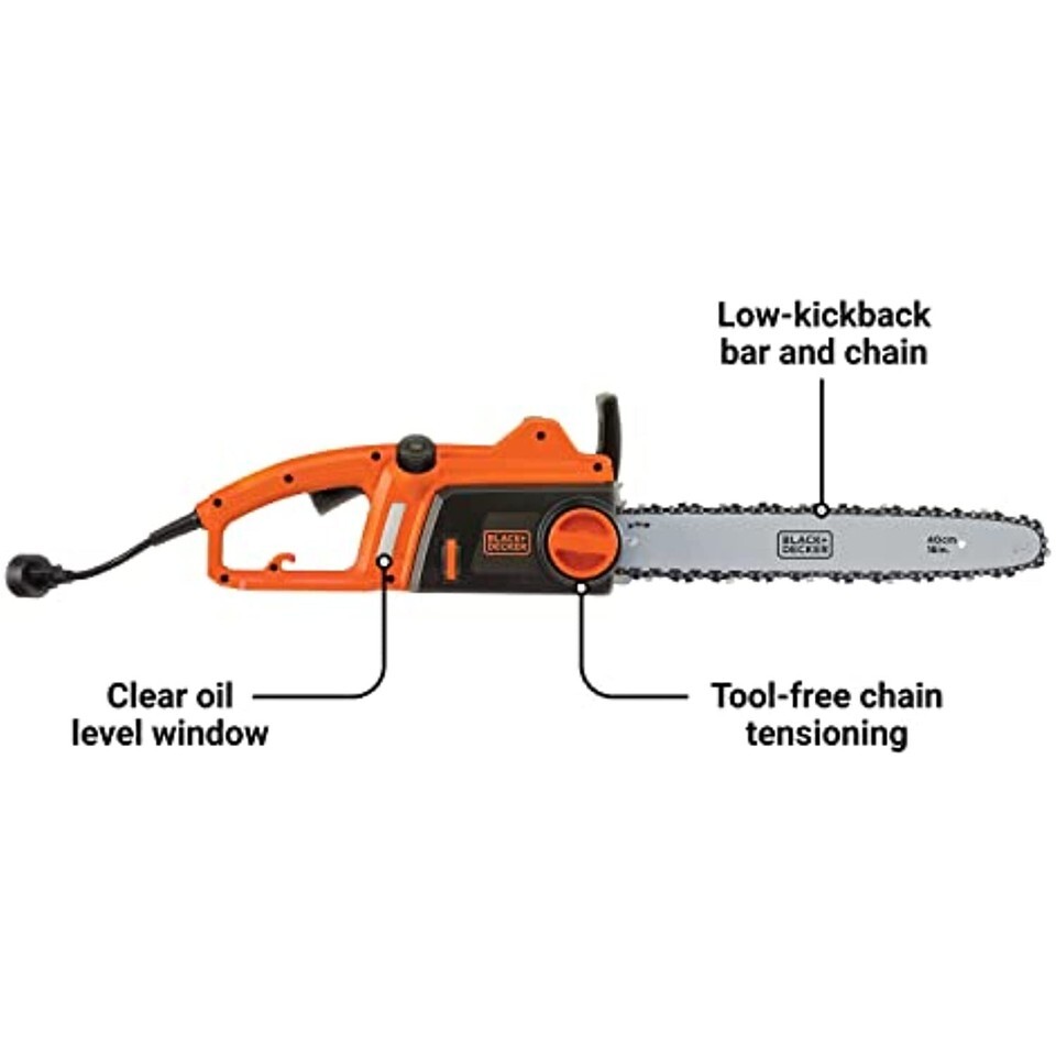 The BLACK+DECKER 16 Amp 12 in. electric chainsaw is equipped with a powerful motor, so you can make quick work of tough branches and logs. Its 16 in. low-kickback bar and chain is designed for smooth operation in different cutting orientations, while the tool-free chain tensioning system allows for fast adjustments without extra tools. Plus, this electric chainsaw?s automatic oiling system and easy-view oil window add extra convenience. And since this chainsaw runs off of electricity, you'll have all the power you need right through to the very last cut.