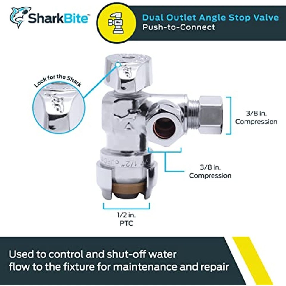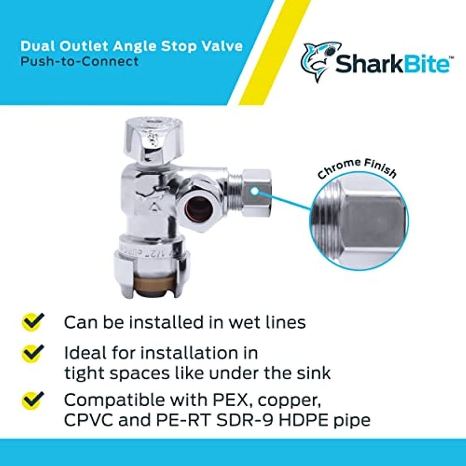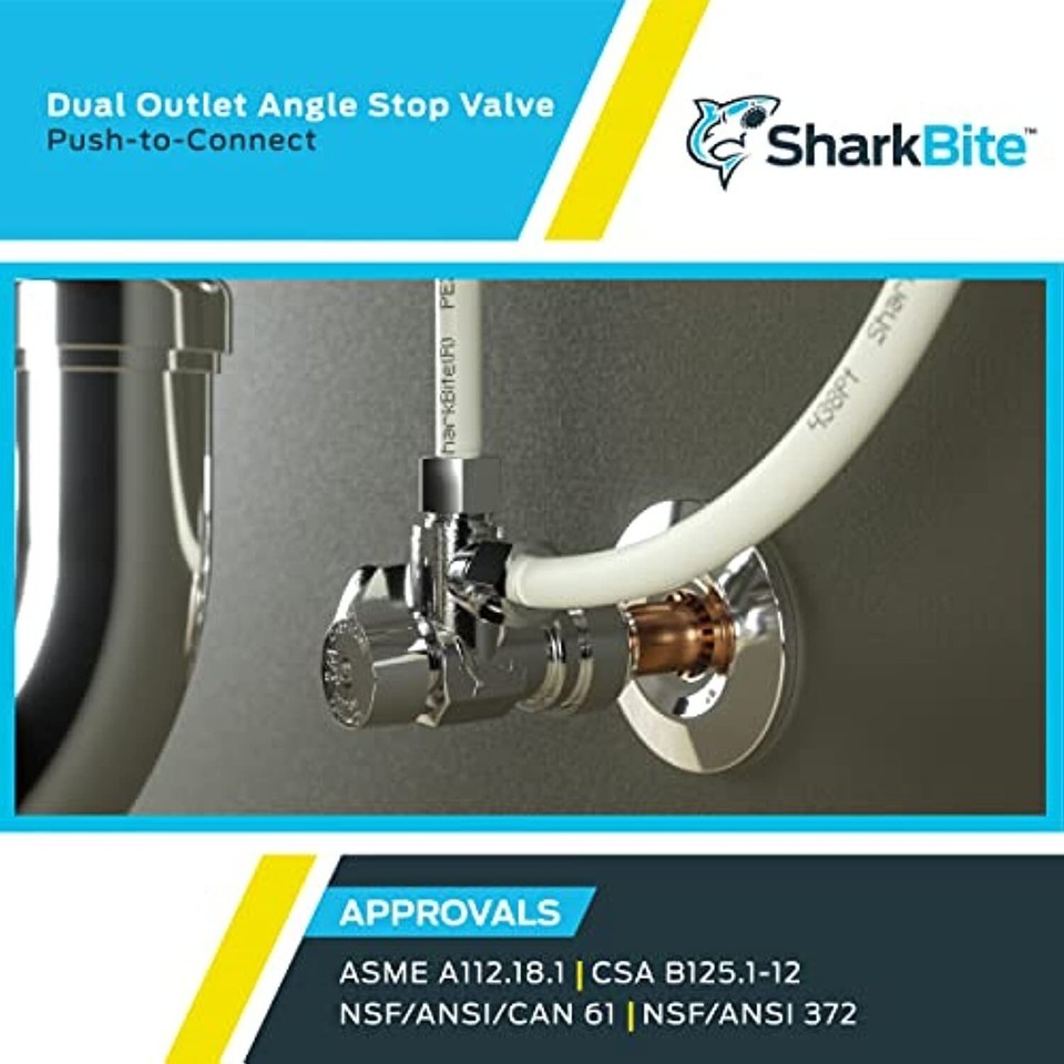 SharkBite 1/2 x 3/8 Inch Compression Dual Outlet Angle Stop Valve, Quarter Turn, Push to Connect Brass Plumbing Fitting, PEX Pipe, PE-RT, CPVC, Copper Pipe, 25558LF