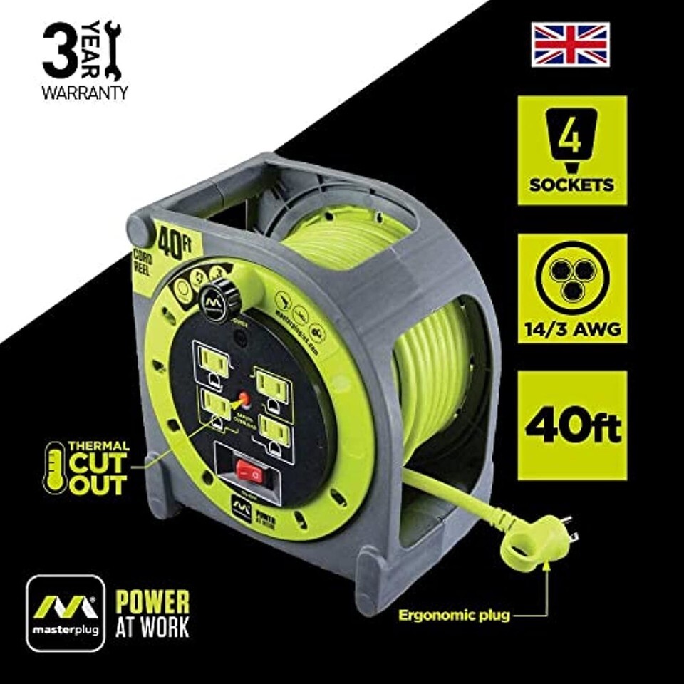 Masterplug Power At Work Four Power Outlets Cord Reel with Winding Handle, Overload Circuit Breaker and Power Switch, 40 Feet 14AWG, High Visibility Cord, Green