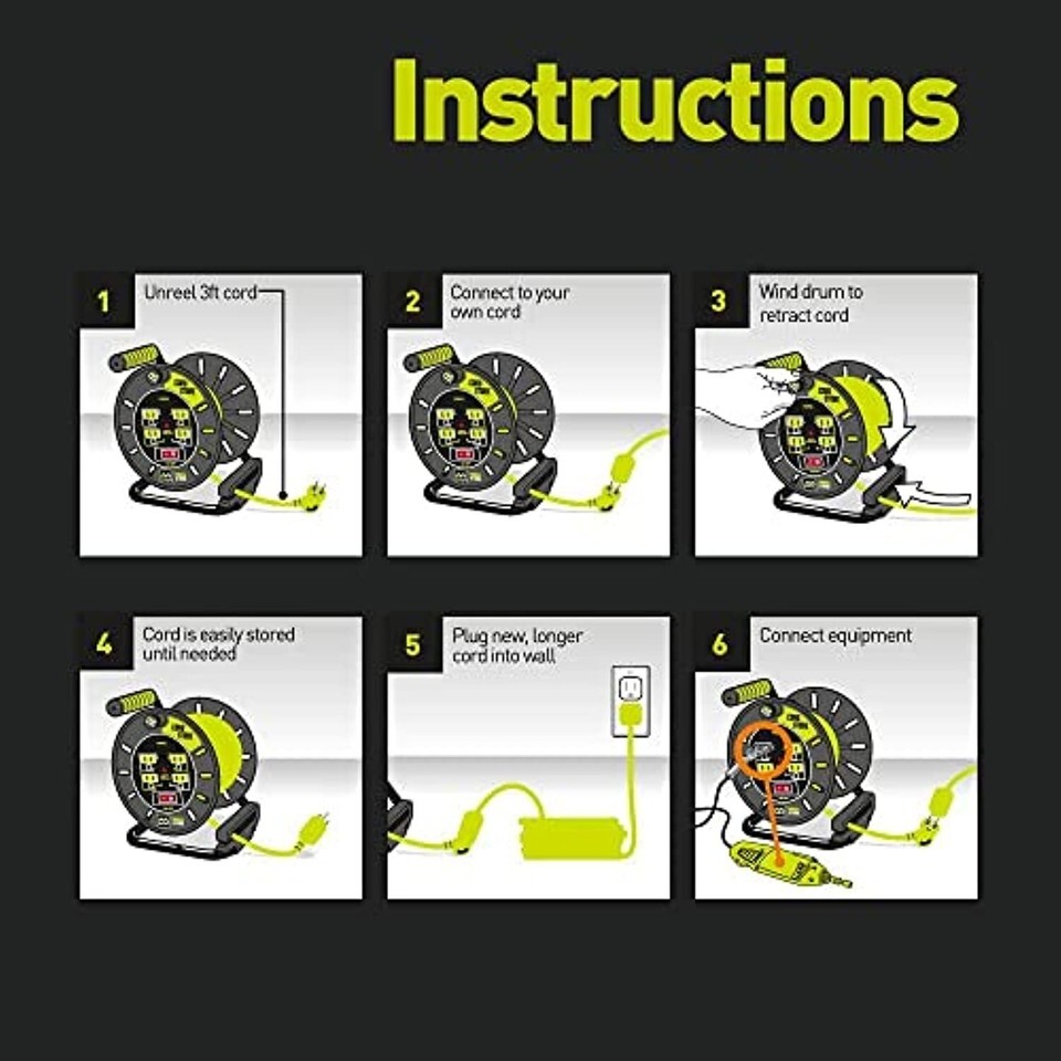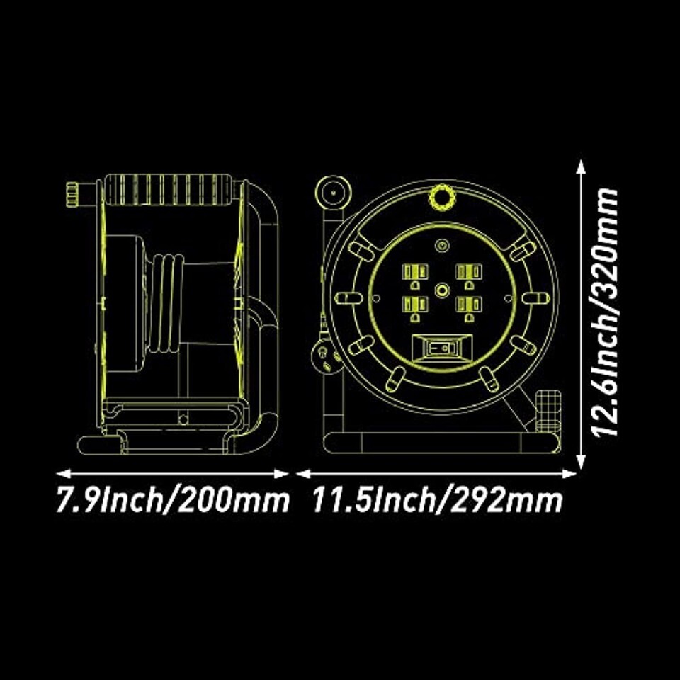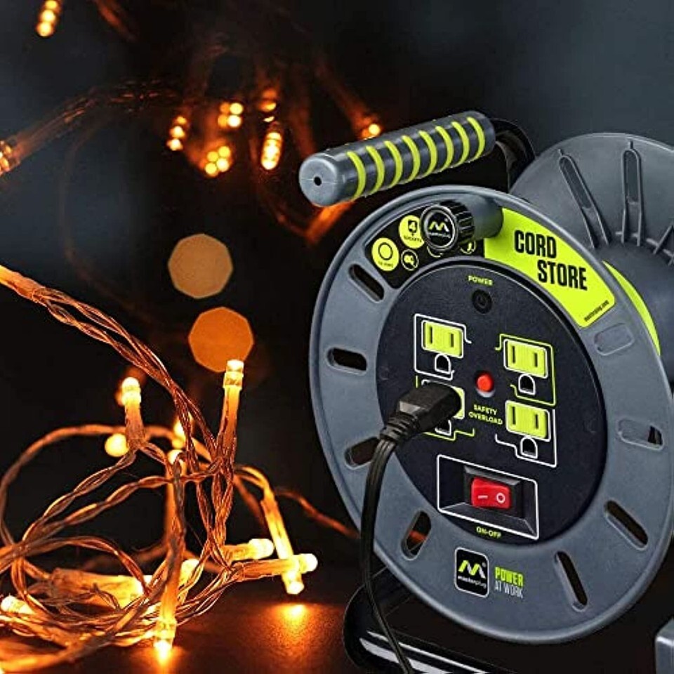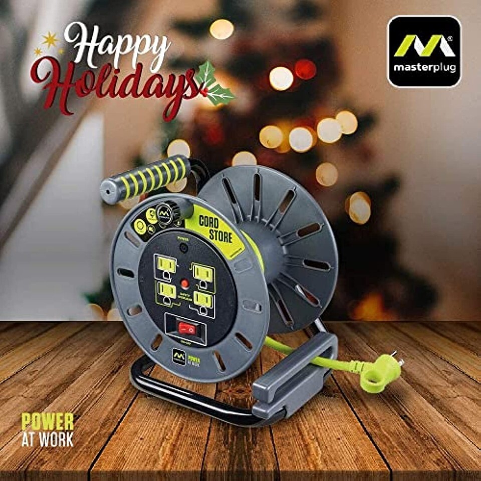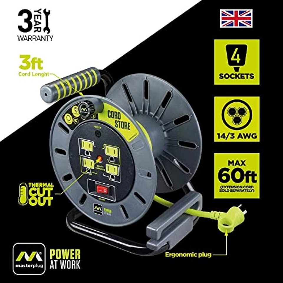 The Masterplug Electrical Cord Storage Reel allows you to add your own cord for easy, tangle-free storage and transportation. It provides additional 4 surge protected outlets along with a built-in overload and reset button, on/off switch, and a power indicator light. This Masterplug Electrical Cord Storage Reel comes with a 3Ft lead providing 1200W of power. Fits ups to 50ft of 14 or 16 AWG cable.
