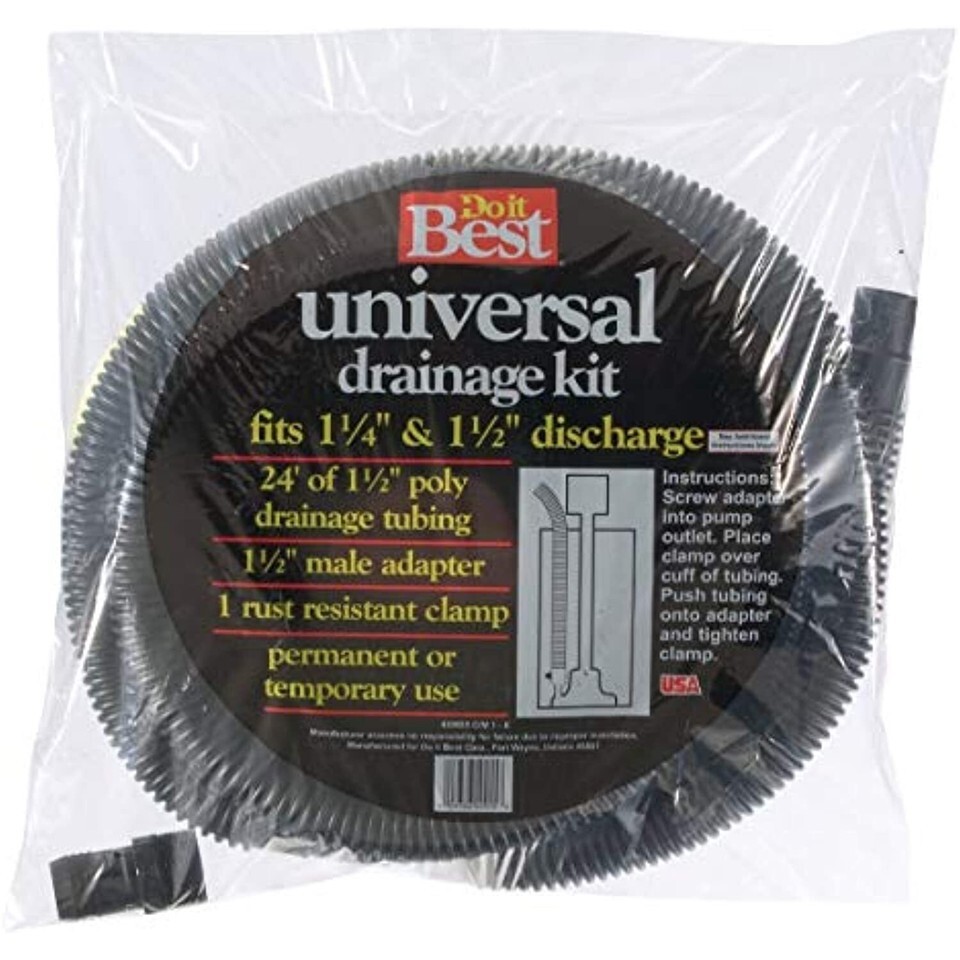 Interior Diameter: 1-1/2 in. Exterior Diameter: 1-1/2 in. Hose Length: 24 ft. Material: Plastic. Flexible. Black. Sump pump hose used for permanent or temporary discharge. Includes: 1-1/2 in. MPT threaded adapter and steel hose clamp. For use with all types of sump pumps to discharge water outside of the basement at a safe distance from the house.