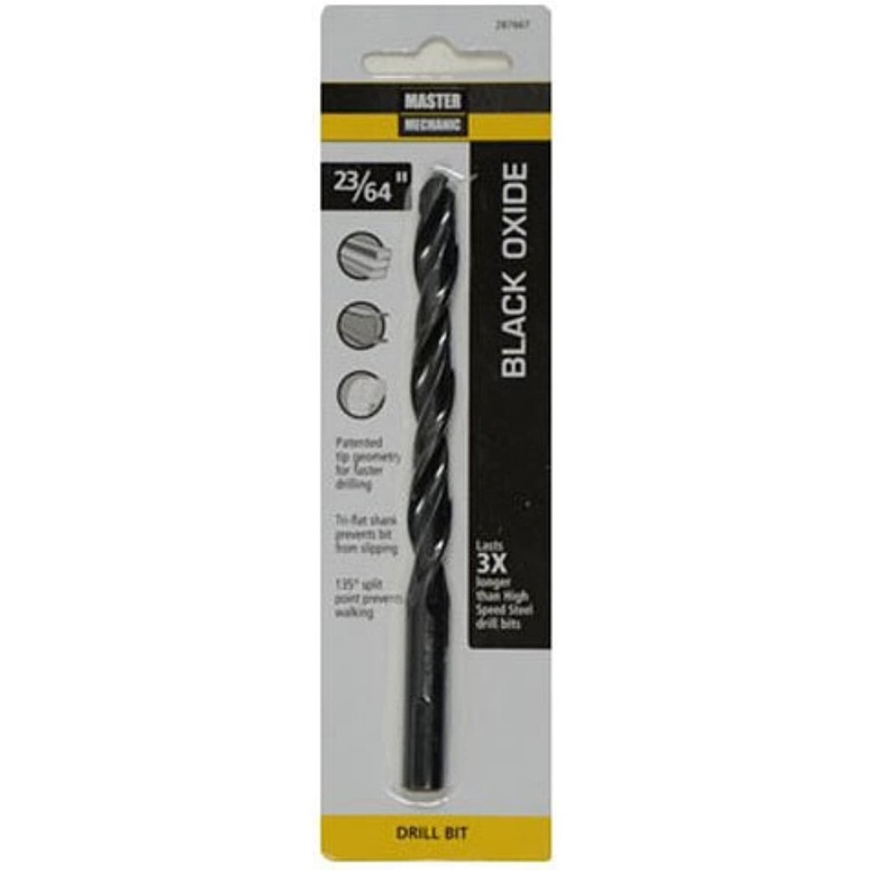 Master Mechanic, 23/64" x 4-7/8", high speed steel BLACK oxide drill bit, jobber length, straight shank, 135 point angle with 4 cutting edges eliminates walking provides fast penetration, BLACK oxide tempering treatment reduces Frictional resistance improves chip flow, recommended for wood, plastic, Wallboard, plywood, soft metals, aluminum, brass bronze, for occasional use in stainless other hard metals, Carded.