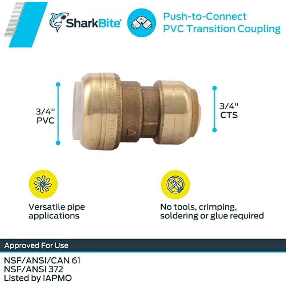 SharkBite 3/4 Inch CTS x 3/4 Inch PVC Transition Coupling, Push to Connect Brass Plumbing Fitting, PEX Pipe, Copper, CPVC, PE-RT, HDPE, UIP4016A