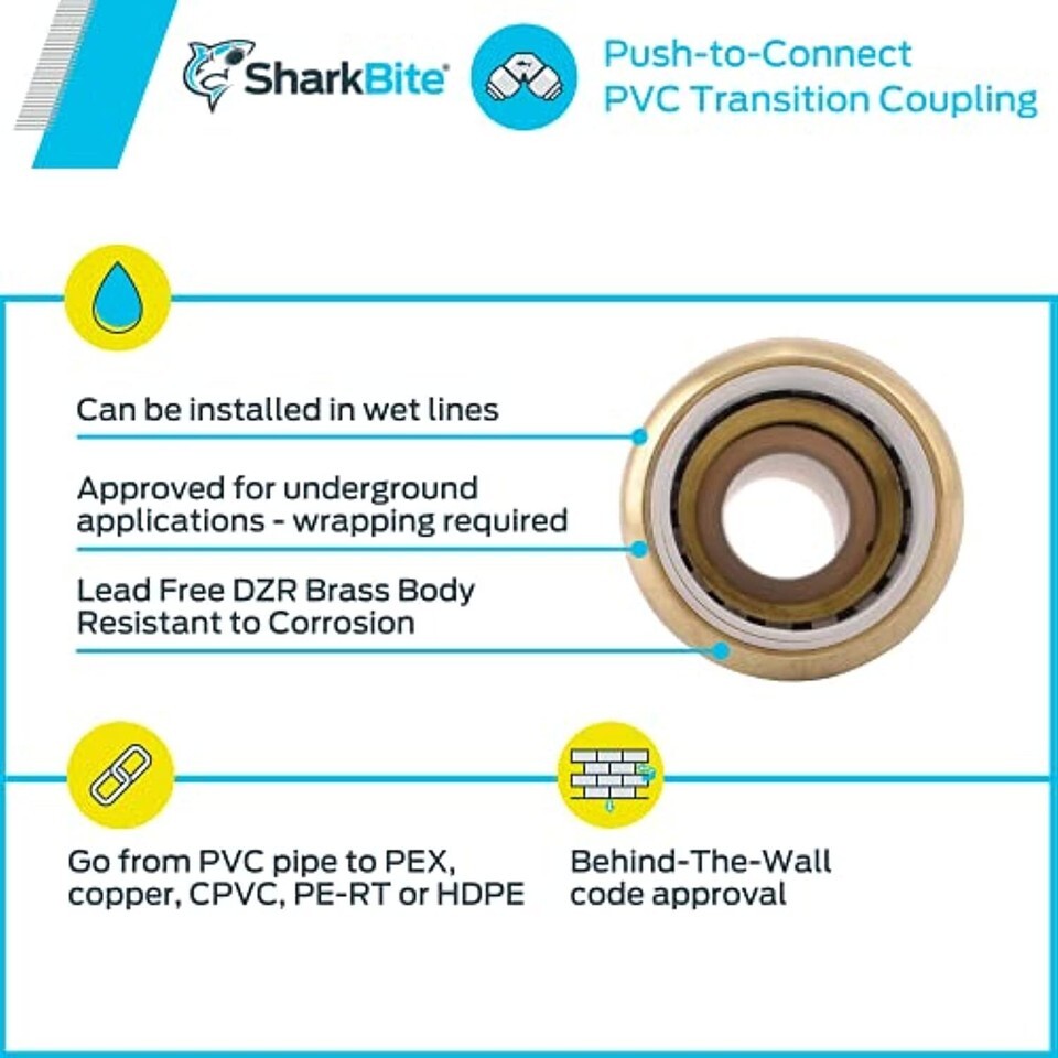 SharkBite 3/4 Inch CTS x 3/4 Inch PVC Transition Coupling, Push to Connect Brass