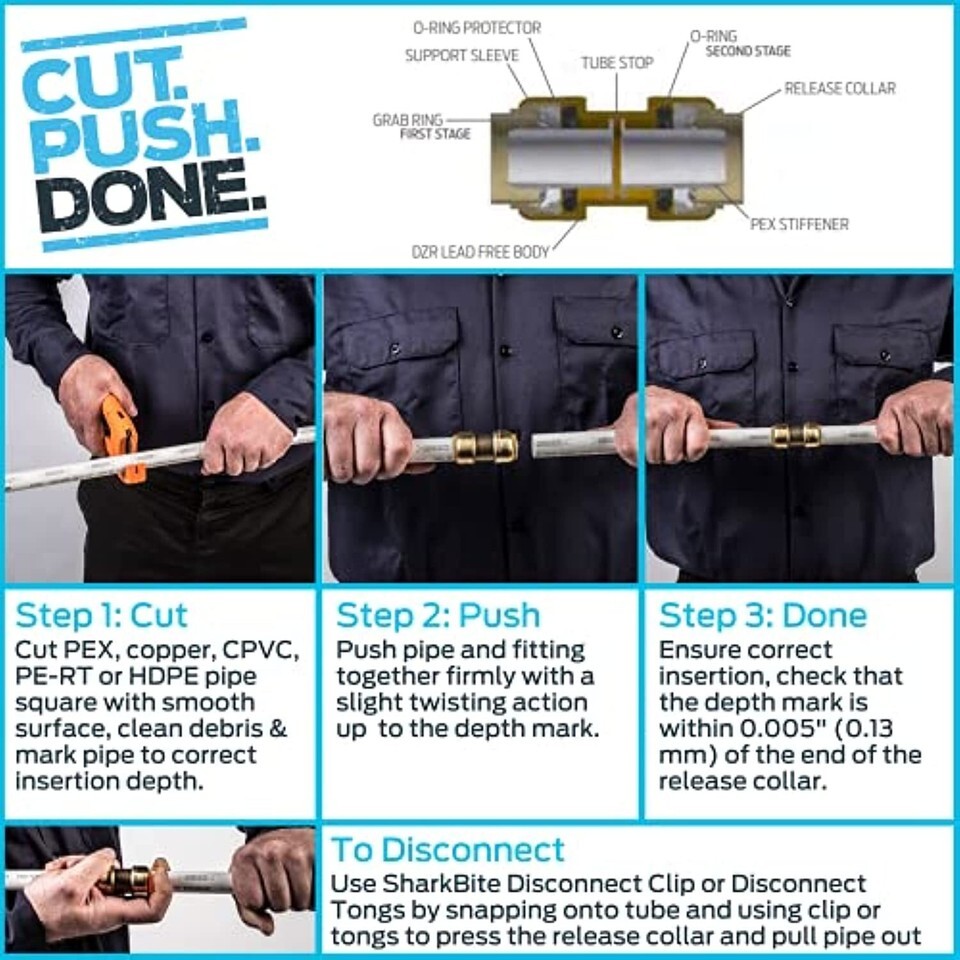 SharkBite Push-to-Connect fittings require no glue, solder or unions